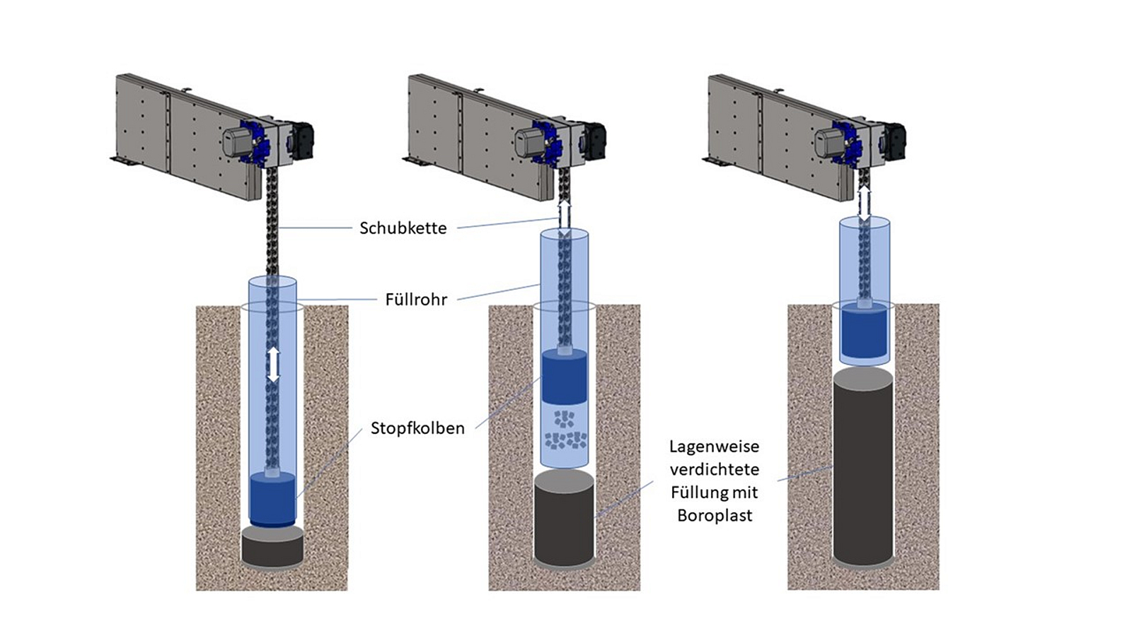 Die Bohrlochstopfmaschine wird an einem Bagger oder an einem Radlader angebracht und über die zu verfüllende Stelle positioniert. Dann wird der bindige Dichtbaustoff lagenweise eingebracht und mit dem Stahl-Stopfkolben der Maschine verdichtet. Angetrieben wird der Stopfkolben der Maschine über eine Schubkette. Über die SIMATIC-Steuerung der Maschine werden genaueste Daten (Verfülltiefe, Lagenstärke, Anpressdruck) zur lagenweisen Verfüllung digital dokumentiert. Die zum Verfahren gehörende GeoLOG App erfasst die Beschaffenheit des so entstehenden Dichtelements vollständig und genau. Die Lage des Bohrlochs und die Baustellenumgebung wird in der GeoLOG App als 3D-Modell erfasst und exakt photogrammetrisch verortet.