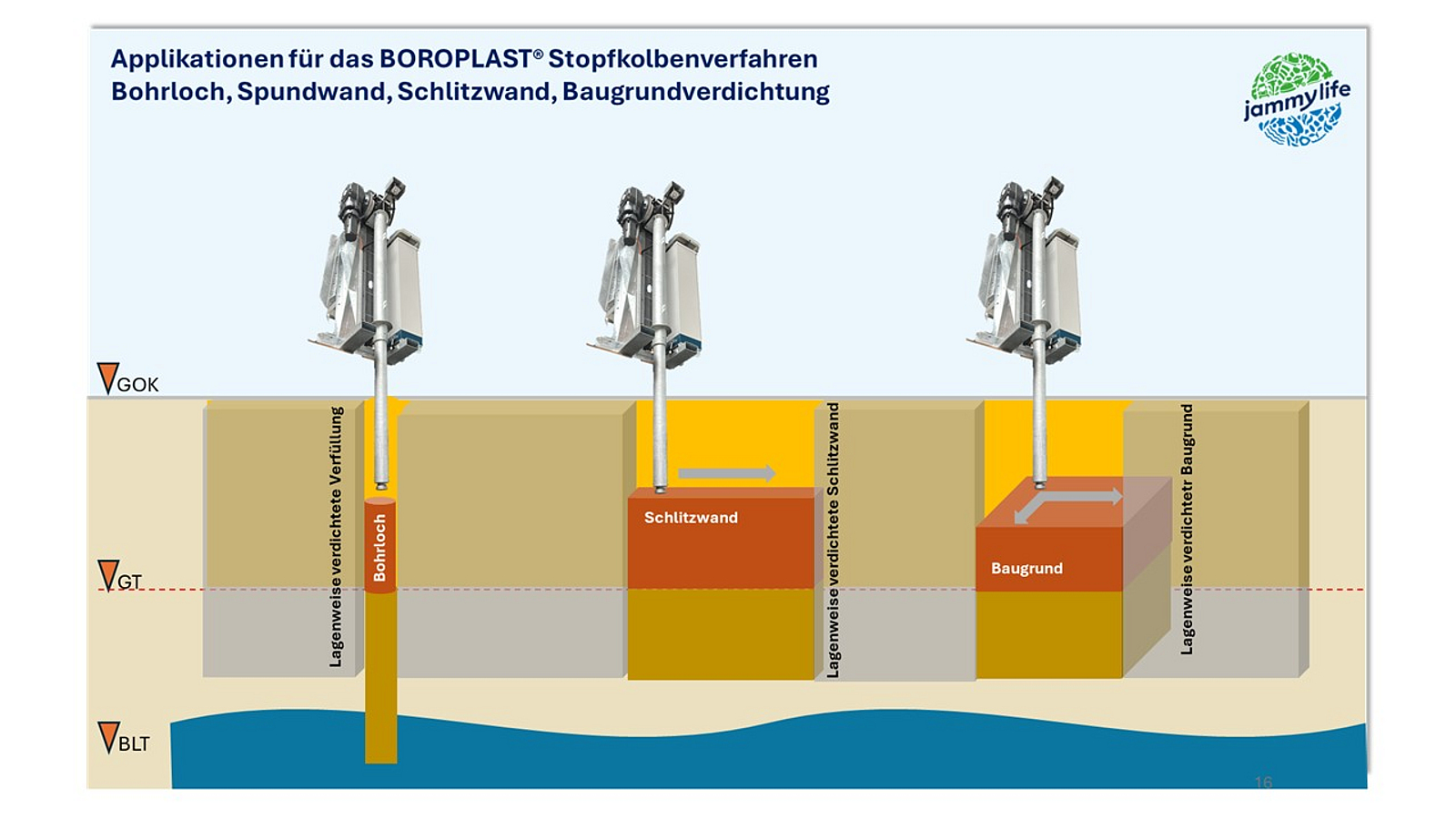 Zu locker verfüllte Bohrlöcher führen oft zu Setzungen im Boden – und der Baugrund sackt nach. Um dies zu verhindern, wird für ein Sanierungsprojekt in der „Neuen Historischen Mitte“ Potsdams das Boroplast-Stopfkolbenverfahren der Jammy Life GmbH zur nachträglichen Baugrundverdichtung eingesetzt. Denn hier besteht aufgrund der Beschaffenheit des Baugrundes (u. a. Feinsande) und der zahlreichen angrenzenden Bauaktivitäten die Gefahr des Nachgebens bzw. Absackens des Bodens.