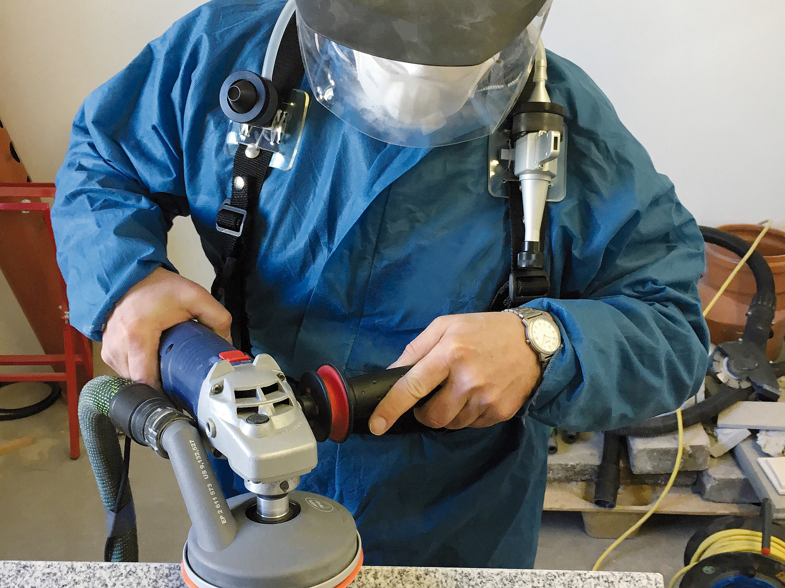 In der Handlungsanleitung „Staub bei Steinmetz- und Naturwerksteinbearbeitung“, die kürzlich zusammen mit weiteren Informationen in einer überarbeiteten dritten Fassung erschienen ist, wird deshalb dieses Schleifsystem für den Einsatz bei Kantenschleifarbeiten ohne Verwendung weiterer Schutzmaßnahmen empfohlen.