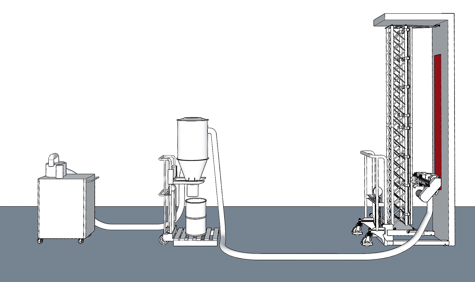 Am Ende des Geräteaufbaus des Dekontaminationsverfahrens steht eine Saugzentrale mit einer Saugleistung von ca. 18.500 l/min. Diese ist über einen Saugschlauch mit dem Zyklonabscheider verbunden. An den Zyklonabscheider können, mit einer maximalen Schlauchlänge von 100 m, die Trägergeräte angeschlossen werden. In die Trägergeräte, in Form von Decken-, Wand-, Boden- und Handfräsen, werden die Fräswerkzeuge eingesetzt. Für das Abfräsen unterschiedlicher Oberflächen bzw. Beschichtungen wurden verschiedene Fräswerkzeuge verwendet.