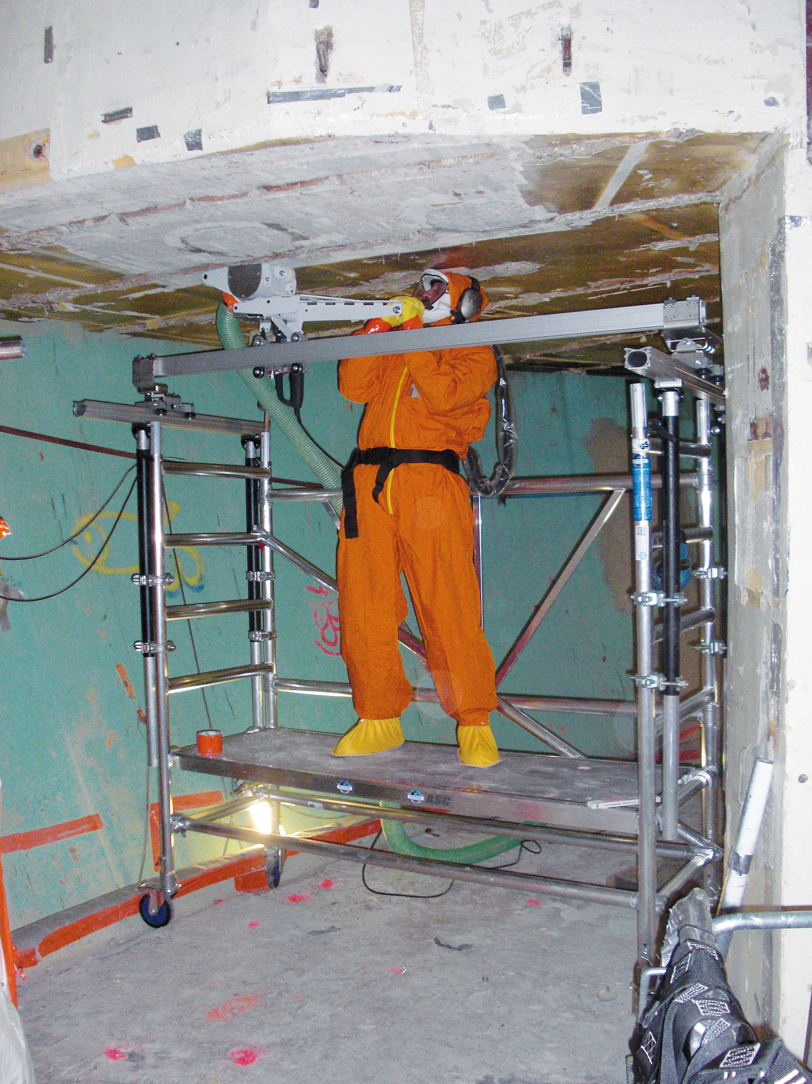 Die automatisierte Gerätetechnik konnte im Vorfeld nicht so genau an die geometrischen Gegebenheiten angepasst bzw. kompakter gestaltet werden, als dass deren Einsatz in den beengten Raumbereichen möglich gewesen wäre. Jedoch ließ sich die manuelle Handfräse aufgrund der langen Schlauchreichweiten in alle Winkel verlegen, während Saugzentrale und Abscheider an zentraler Stelle vor der Materialschleuse verblieben.