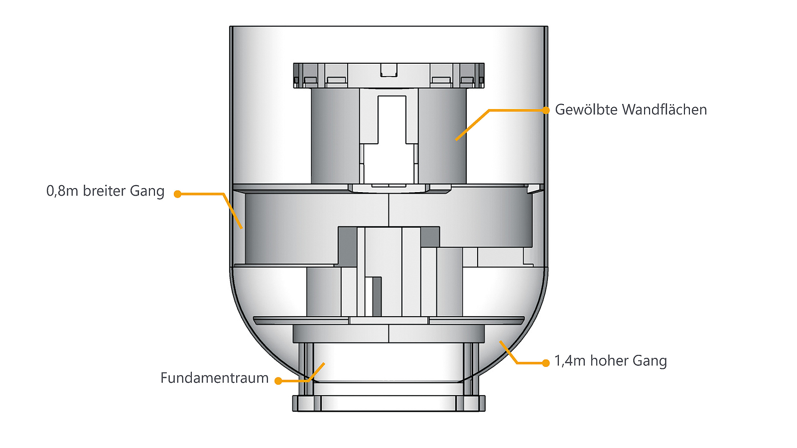 Zuerst einmal gab es geometrische Herausforderungen, da Arbeiten unter beengten Verhältnissen auszuführen waren. Im Modell ist ein Umlauf mit nur 1,4 m hohen Decken zu sehen, dessen einziger Zugang über eine mannbreite Deckenöffnung besteht. Außerdem gab es einen 0,8 m breiten Gang mit 3,5 m Arbeitshöhen und einen Kellerbereich, der nur über eine 5 m hohe Stehleiter zugänglich war. Dementsprechend konnte keine große Gerätetechnik eingesetzt werden. Darüber hinaus wiesen etwa 95 % der Wände eine gewölbte Oberfläche auf.