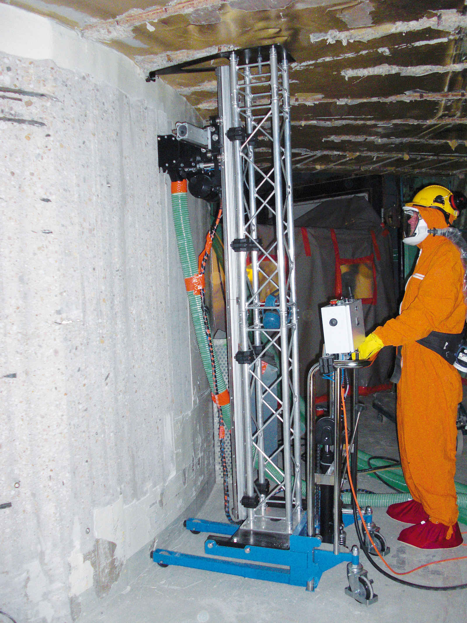 Als Grundmodell der Dekontaminationstechnik wurde ein bestehender Geräteaufbau für den emissionsarmen Abtrag von asbesthaltigen Beschichtungen gewählt. Dieser wurde im Vorfeld anhand eines CAD-Modells des Reaktorgebäudes an die Begebenheiten im Inneren angepasst. Dabei wurde das Fräswerkzeug für den Betonabtrag neu entwickelt und die Motoren und Bausteile verstärkt, um die höheren Belastungen zu beherrschen.