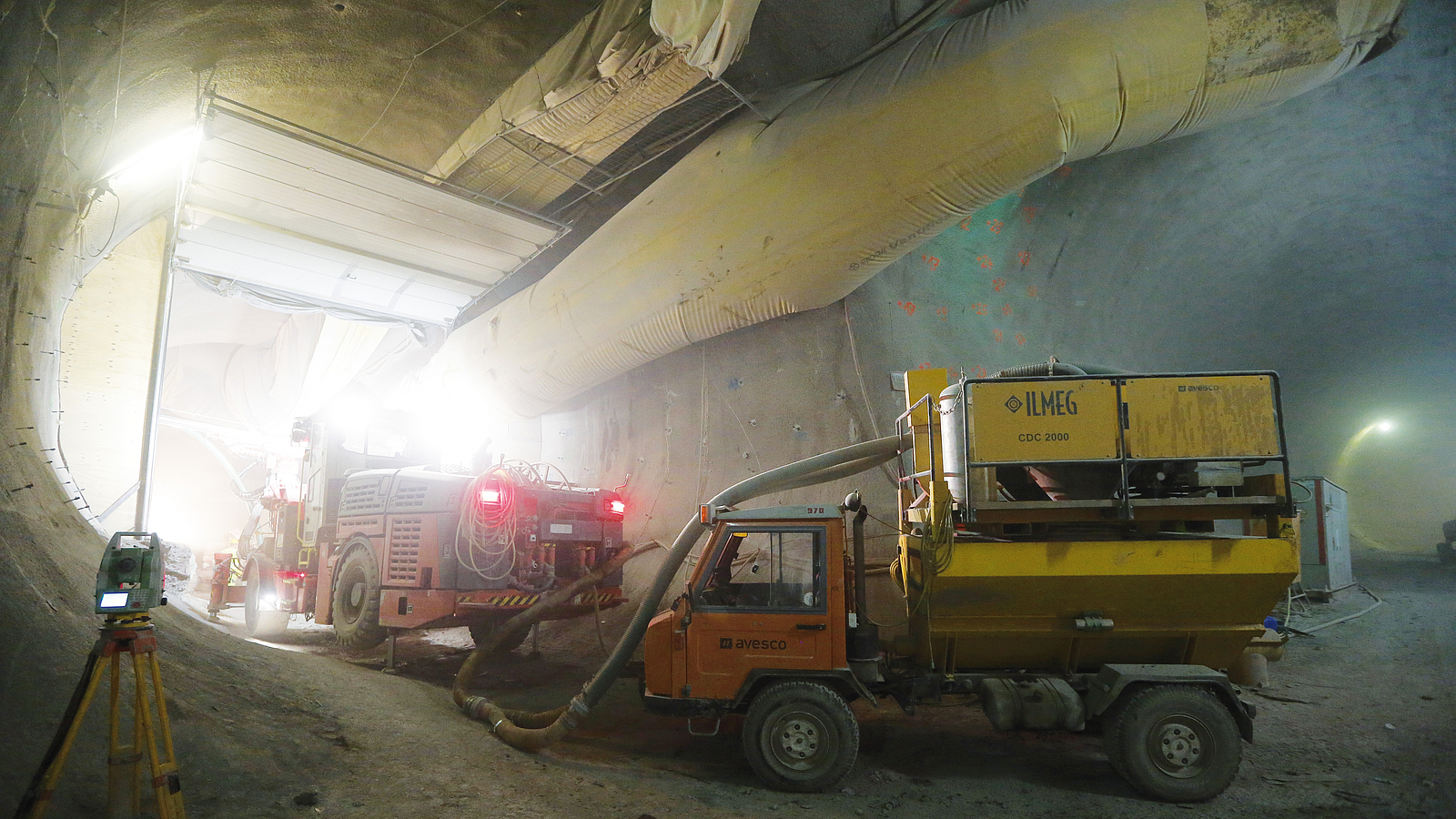 Um den nötigen Verbund zwischen den einzelnen Spritzbetonlagen herzustellen, wird in der Regel mittels Druckluft gründlich vorgereinigt bzw. auch vorgenässt. In den Bereichen des trockenen Vortriebs war dies nicht möglich, da ohne Wasserzugabe zu viel Staub in die Atemluft gelangt wäre. Daher setzte die ARGE im Sohlbereich Industriesauger mit einem Luftdurchsatz von 1.300 m³/h ein, um den Staub vor dem Auftragen weiterer Spritzbetonlagen zu fassen und zu beseitigen. Im Bereich der Strossenlaibung und der Firste verwendete die ARGE eine Bürste mit Absaugvorrichtung, die an einen Baggerarm montiert werden kann.