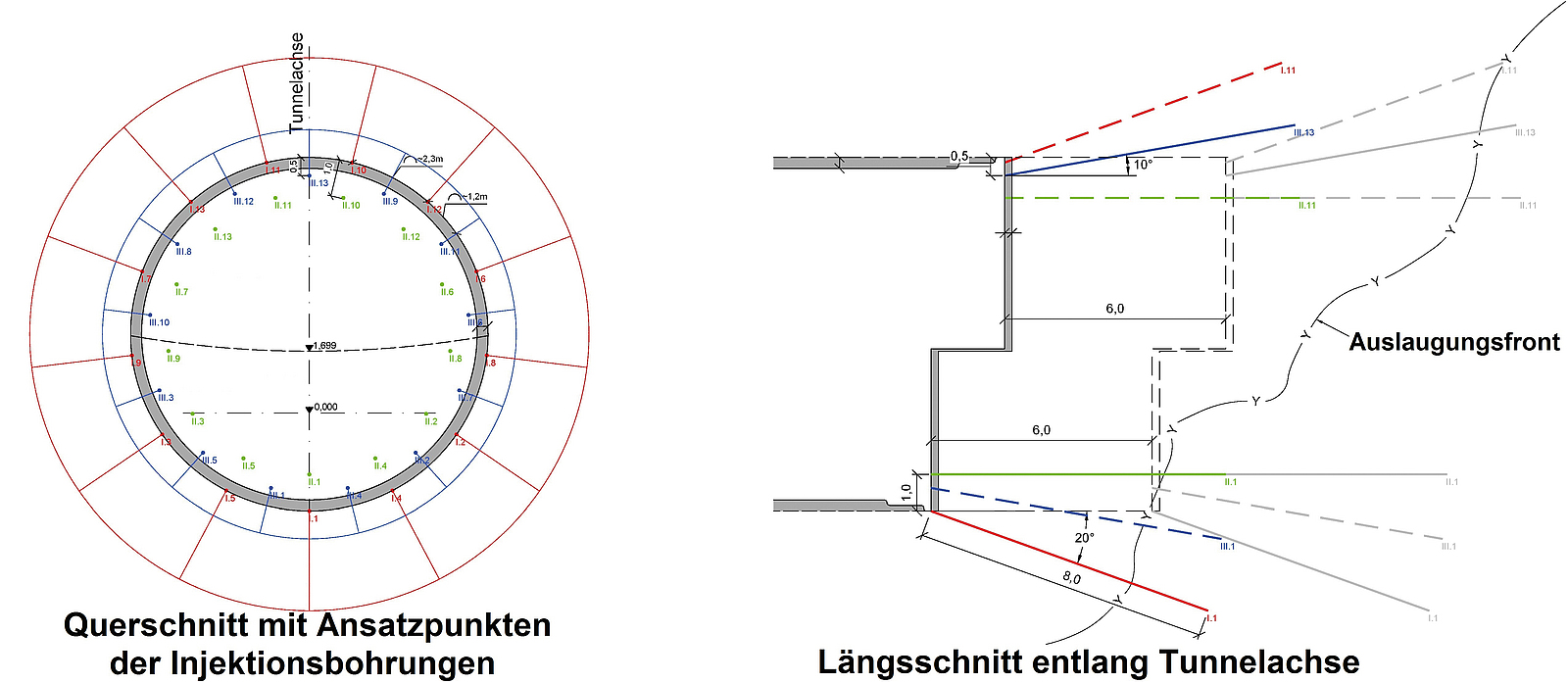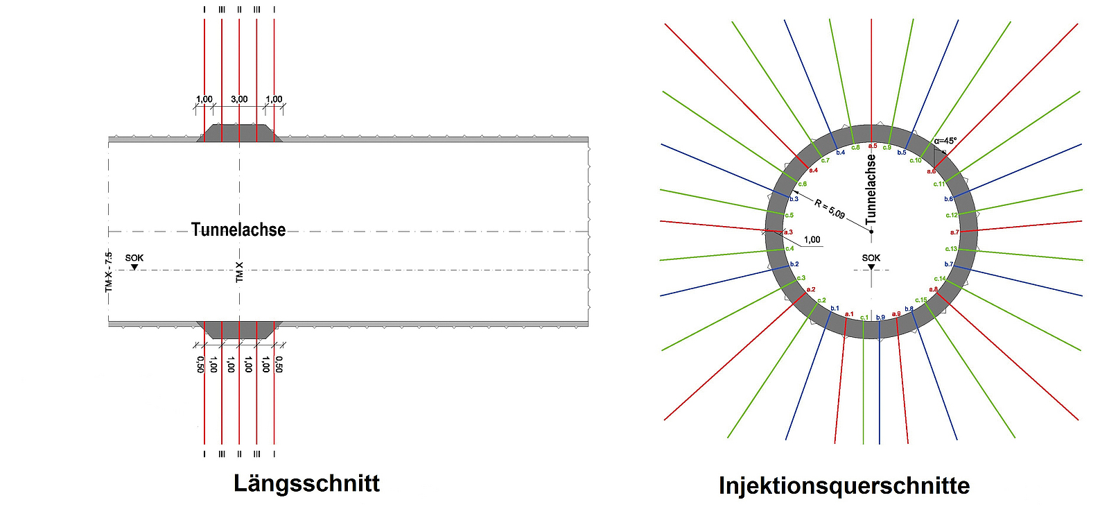 Durch Ausbruch und Sicherung entsteht rings um den Tunnel eine Auflockerungszone, in der die Durchlässigkeit des Gebirges deutlich erhöht ist (Durchlässigkeitsbeiwert > 10–3 m/s). Um in den Tunnelabschnitten im anhydritführenden Gebirge die Durchlässigkeit der Auflockerungszone wieder zu reduzieren, wurden umfangreiche Abdichtungsinjektionen mit Acrylatgel ausgeführt. Hierzu wurden je nach Lage des anhydritführenden Gesteins sowie der wasserführenden Schichten 4–10 m lange radiale Injektionsbohrungen mittels eines programmierten Bohrschemas (Ansatzpunkt, Richtung, Bohrtiefe) abgeteuft. Die Injektionen erfolgten zunächst in einer a-Serie in Querschnitten alle acht Tunnelmeter, dann in einer b-Serie zwischen den Injektionspunkten der a-Serie in denselben Querschnitten, anschließend a- und b-Serie in dazwischenliegenden Querschnitten usw. bis zu einem Abstand der Querschnitte von einem Meter. Nach Injektionen aller a- und b-Serien wurde bei Bedarf die c-Serie (Bohrlöcher in einem Querschnitt zwischen den Bohrungen der a- und b-Serie liegend) injiziert (beispielhafter Injektionsquerschnitt siehe Abb. 5). So wurde nach und nach das Injektionsraster auf bis zu 1 × 1 m verdichtet. Die Injektionseinheiten sowie die Bohrwägen durchfuhren auf diese Weise ein und denselben Tunnelabschnitt bis zu zwölf Mal. Die jeweils geringere Aufnahme von Injektionsmaterial durch den Fels diente dabei als Kontrolle des Injektionserfolgs. [2]