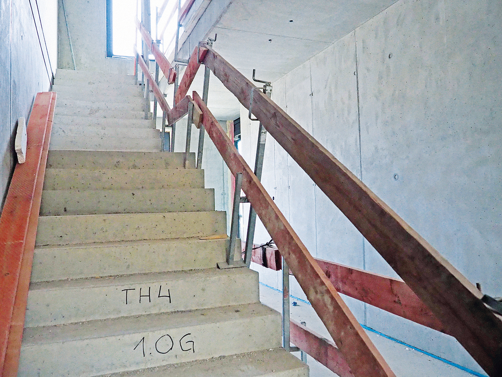 In den Innenräumen sind akustisch wirksame Holzverkleidungen und Architekturbeton im Wechsel vorgesehen. Die Wände und Decken der Klassenräume bestehen aus 5.000 m2 Sichtbeton der Klasse SB 2, die der Flure sowie des Foyers aus etwa 3.000 m2 Sichtbeton in der Qualität SB 3. „Um die Anzahl der symmetrisch angeordneten Spannstellen und der Schalelementfugen auf ein Minimum zu begrenzen, bauten wir großformatige Schaltafeln (2,50 × 3,50 m) ein“, berichtet Marco Kulimaga, Oberbauleiter im Berliner Büro der Riedel Bauunternehmen GmbH, Erfurt. Sie stellte den Rohbau und die Fassade bereits im April 2019 fertig. „Bis auf eine kleine Ecke der Fassade im zweiten Obergeschoss, da lange Zeit nicht entschieden war, wie Lüftungsrohre aus dem Gebäude zum Dach geführt werden, war alles im April 2019 fertig. Die Konstruktion des Stahlskelettbaus mit tragenden Wandscheiben aus Ortbeton und die großformatige Fassade stellten für uns insgesamt keine erhebliche Hürde dar.“