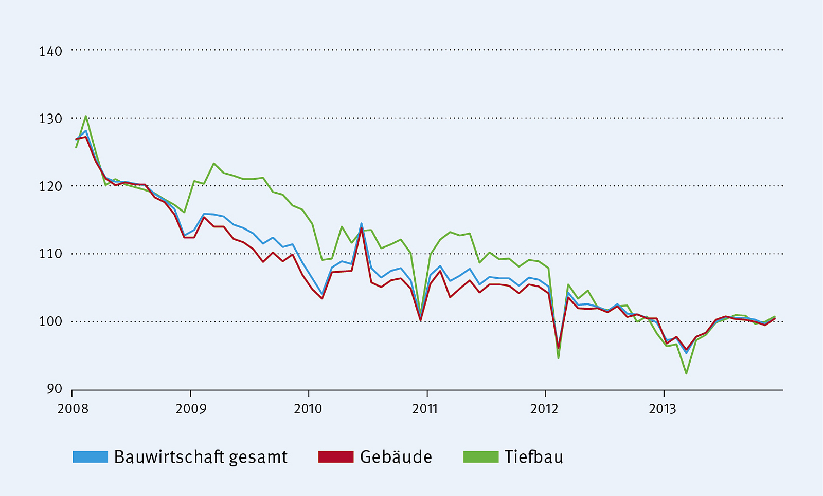 Interessant ist nun, dass der Bauindex jedoch noch in den darauffolgenden fünf Jahren (2008 bis zum Frühjahr 2013) einen deutlichen Abwärtstrend aufwies. Er erreichte im März 2013 seinen niedrigsten Stand. In diesen fünf Jahren verlor der Gesamtbauindex fast 33 Punkte; erst danach begann er sich langsam zu erholen, ohne jedoch seinen früheren Höchststand vom Februar 2008 wieder zu erreichen. Abbildung 3 verdeutlicht diese Entwicklung.
