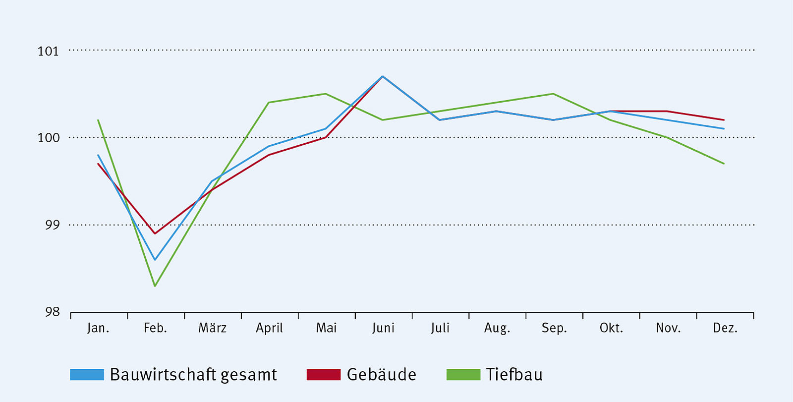 Abbildung 2 zeigt die durchschnittliche monatliche Entwicklung der gesamten Bau-, Hoch- und Tiefbauarbeiten im Jahreszyklus, gemessen in den Jahren 2010 bis 2019 in der EU-27 (um die verschiedenen Indexniveaus vergleichbar zu machen, wurden alle Jahre auf einen Durchschnittswert von 100 zusammengefasst). Erkennbar wird ein jahrestypischer Verlauf: Im Durchschnitt verringerten sich die Indizes für das Baugewerbe zwischen Januar und Februar jeweils um einen oder zwei Indexpunkte, um im März wieder den früheren Stand zu erreichen. Dieser wird im April und Mai übertroffen. Zu Beginn des Winters werden die Bautätigkeiten dann wieder etwas reduziert.