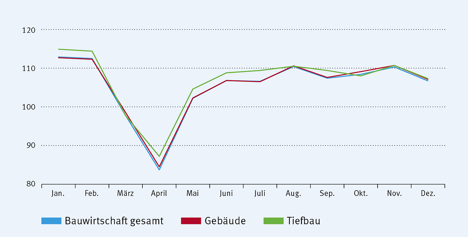 Abbildung 1 zeigt die Entwicklung der Bautätigkeiten zwischen Januar und Dezember 2020 für Bauleistungen insgesamt, Gebäude und Tiefbau.
