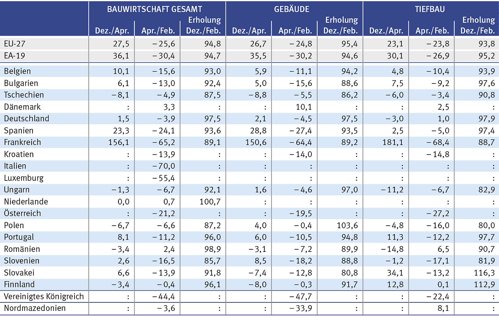 Im November 2020 hatten mehr als die Hälfte der Länder, für die Daten vorlagen, wieder einen Stand von über 95 % des Vorkrisen-Niveaus vom Februar erreicht. Doch hatten infolge des allgemeinen Rückgangs der Bautätigkeit im Dezember nur fünf Länder diesen Erholungsgrad erreicht oder übertroffen (die Niederlande, Deutschland, Rumänien, Finnland und Portugal). Die Niederlande sind das einzige Land, in dem das derzeitige Produktionsniveau (leicht) höher ist als im Februar 2020. Länder mit einem Erholungsgrad von unter 90 % sind Slowenien (85,7 %), Polen (87,2 %), Tschechien (87,5 %) und Frankreich (89,1 %).