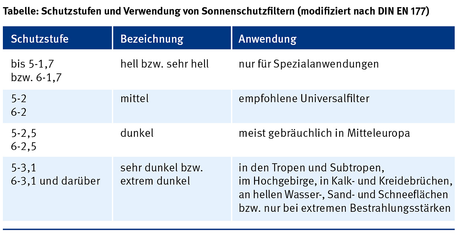 Für Sonnenbrillen, die auf der Baustelle oder im gewerblichen Bereich eingesetzt werden, gelten die DIN EN 172 und die DIN EN 166.