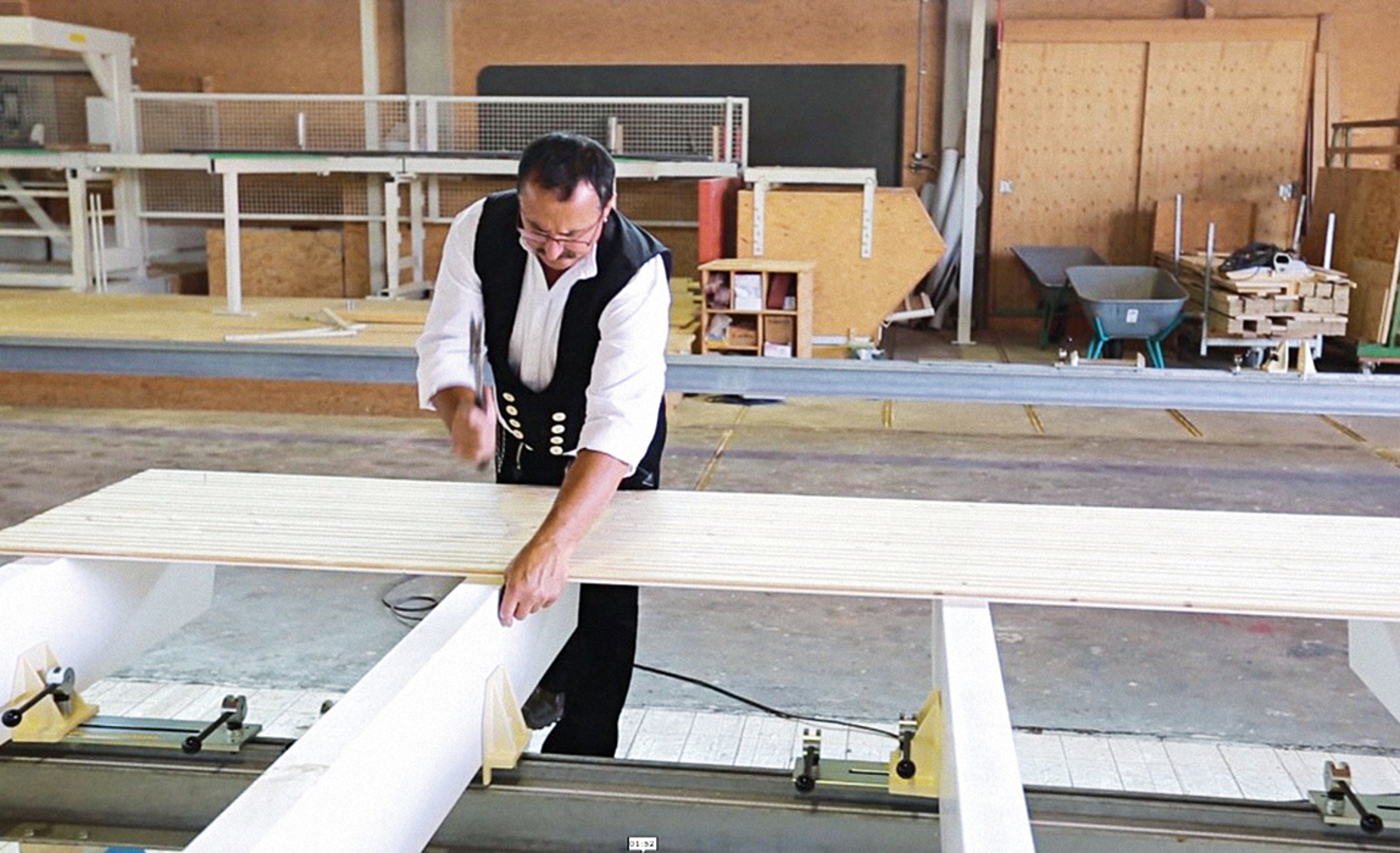 An zwei Montagetischen werden zum einen Wandelemente und zum anderen Dachelemente vorgefertigt. Wie diese Elemente später in das Gebäude versetzt und eingehoben werden, zeigen anschaulich kurze Filme am Messestand. Vor Ort werden dann auch Hilfsmittel zum komfortablen und sicheren Versetzen und Einheben wie Traversen und verschiedene Lastaufnahmemittel vorgestellt. Für die individuelle Erkundung der Vormontage gibt es parallel noch eine VR-Anwendung. Mit der VR-Brille (VR: Virtual Reality) können die Standbesucherinnen und -besucher in eine virtuelle 360°-Umgebung eintauchen und so den Prozess der Vormontage von Dachelementen sowie die spätere Montage auf der Baustelle eigenständig und interaktiv erkunden.