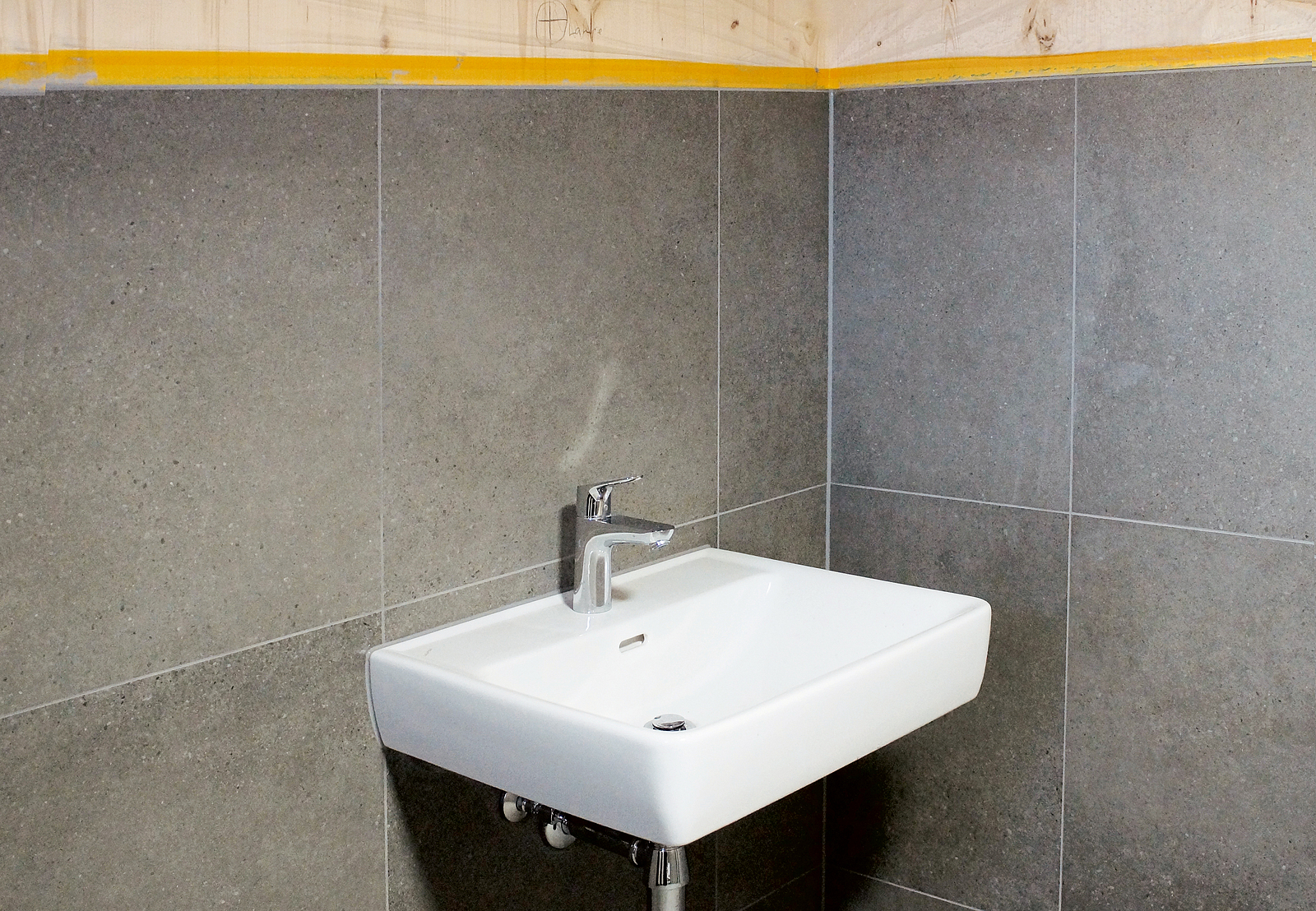 Bei den ebenfalls im Neubau befindlichen Sanitäranlagen bestand die Aufgabe in der Verlegung von Wand- und Bodenfliesen. Hierzu wurde zunächst im unteren Wandbereich die „BP Bauplatte“ von Botament aufgebracht. Die Trägerplatte besteht aus extrudiertem Polystyrolschaum. Sie ist wasserdicht und eignet sich daher besonders für Feuchträume. Bei der Verlegung der Wandfliesen wurde ein Leichtfliesenkleber für großformatige Fliesen eingesetzt, der sich dank der speziellen Airflow-Technologie leicht und geschmeidig verarbeiten lässt. Der Bodenbelag wurde mit einem faserarmierten und hochflexiblen Fließbettkleber verlegt. Dieser ist besonders für die Fliesenverlegung auf jungen Untergründen geeignet und auch bei beheizten Flächen anwendbar. Im Bereich der Duschen wurden die Wände zudem mit der „AE Abdichtungs- und Entkopplungsbahn“ verklebt. Als Oberfläche wurde eine großformatige Fliese in einem Grauton gewählt. Die Fugen in einem hellen Grauton sind farblich auf das Gesamtkonzept abgestimmt.
