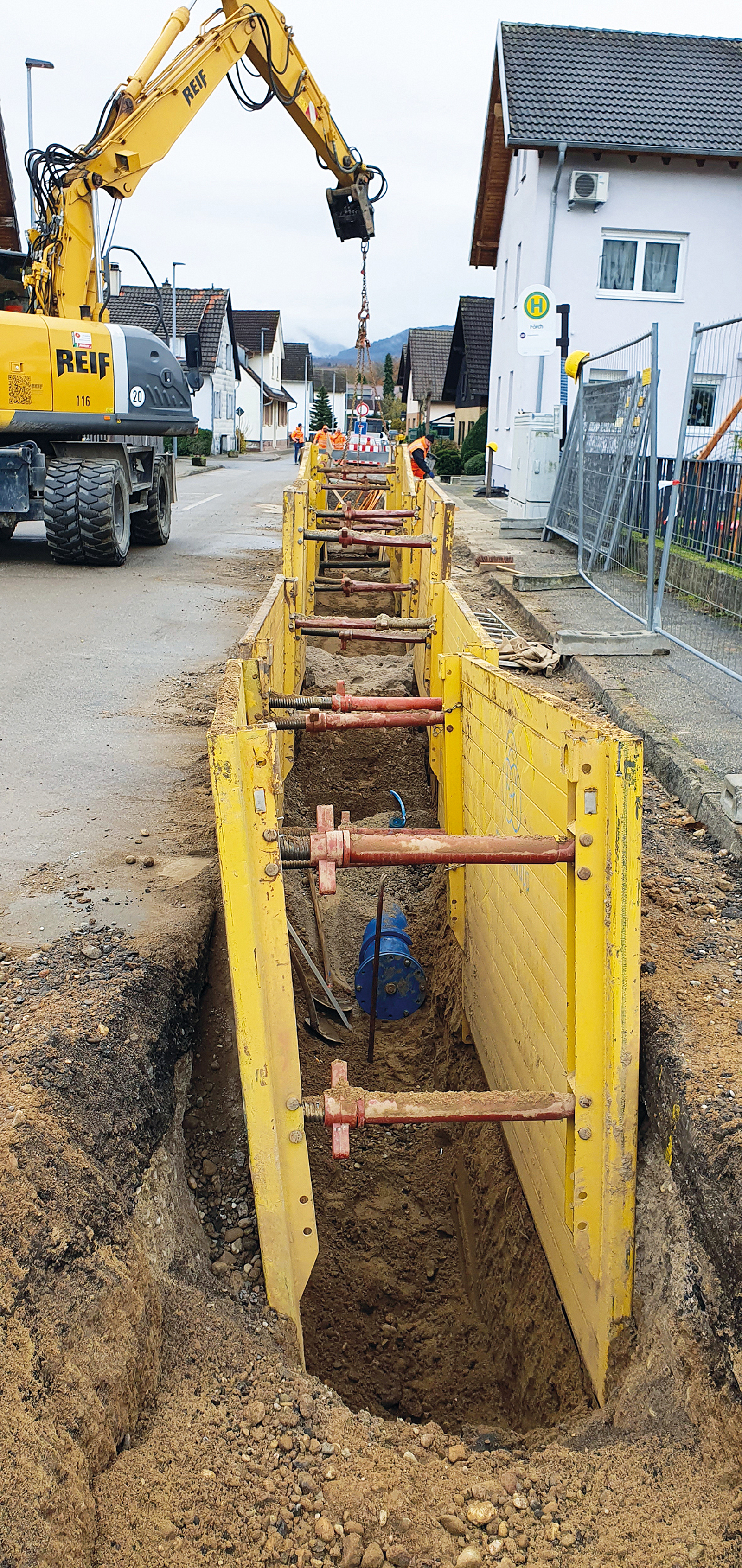 Um eine geschützte Weide und einen Bach auf 40 m der insgesamt rund 2,5 km langen Strecke schonend zu unterqueren, erfolgte der Einbau der Stahlrohre DN 600, in denen nicht nur die Wasserleitung DN 300, sondern auch Leerrohre für den Breitbandausbau Platz haben, mittels Horizontaldurchpressung. Auf der restlichen Strecke verbaute REIF Rohre der Nennweite DN 300 aus duktilem Gusseisen mit Faserzementumhüllung (GGG-ZM) sowie Leerrohre. Auch für die Herstellung des Fahrbahnbelags ist das Unternehmen zuständig.