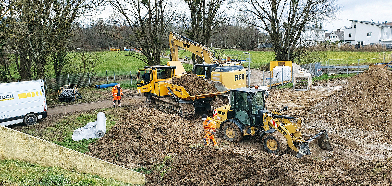 Zu den wesentlichen Rahmenbedingungen, die das aktuelle Baugeschehen vor Ort sehr nachhaltig bestimmen, gehört der hohe Grundwasserstand. Aus diesem Grund wurde die holländische Bauweise an den Stellen eingesetzt, wo mit anstehendem Grundwasser gerechnet werden musste. Bei dieser Bauweise wird Flüssigboden als Dichtung gegen das Grundwasser eingebaut. Projektleiter Michel Daul erklärt, wie dies ablief: „An den betreffenden Stellen haben wir den Baugraben tiefer und breiter ausgehoben, als das sonst bei einer konventionellen Ausführung üblich ist. Der Grabenquerschnitt wird durch eine vom Baugrund abhängige Fachplanung definiert. Hier haben wir anteilig Flüssigboden als Dichtung gegen das Grundwasser eingebracht. Nach dem selbstverdichtenden Aushärten konnten wir in einem zweiten Schritt einen schmaleren Graben ohne Grundwasser im bereits eingebauten Flüssigboden herstellen und die Rohre dann sauber und trocken verlegen. Anschließend haben wir den Graben mit Flüssigboden aufgefüllt. Der Flüssigboden wird nur bis zu einer Tiefe von ca. 2,30 m eingebaut und stellt somit keinen ‚Riegel‘ dar. Der Grundwasserstand wird auf jeder Seite des Flüssigbodens immer gleich sein.“