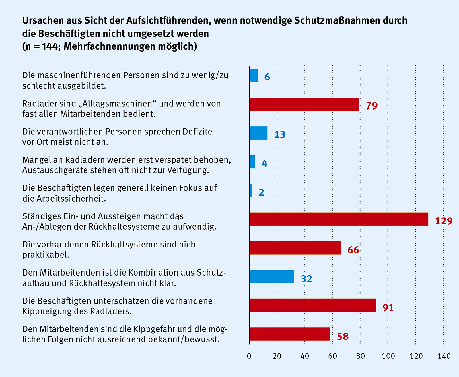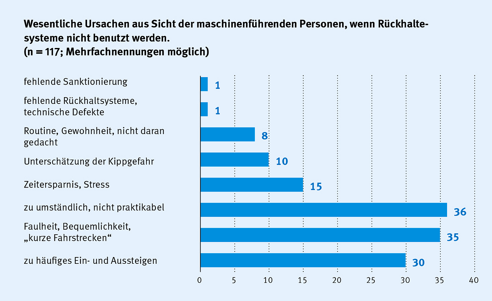 Die unzureichende Anwendung der Rückhaltesysteme in der Praxis hat diverse Ursachen und Hemmnisse. Die Beteiligten gehen davon aus, dass es bei der täglichen Arbeit mit ihrer Erdbaumaschine „wahrscheinlich nicht“ zu einer Situation kommt, die zu einem Kippen oder Umstürzen führen könnte. Oft wird dabei die alltäglich vorhandene Umsturzgefährdung unterschätzt bzw. sind den Beschäftigten diese Gefährdung und die möglichen Folgen nicht ausreichend bekannt und bewusst. Die als überwiegend „gar nicht gut“ bzw. „weniger gut“ empfundene Ergonomie der Rückhaltesysteme trägt zur schlechten Akzeptanz dieser bei. Daneben wird diese Schutzeinrichtung als zu umständlich und nicht praktikabel angesehen bzw. macht gerade das häufige Ein- und Aussteigen die Benutzung zu aufwendig. Allgemeine Bequemlichkeit oder das Absolvieren von „kurzen Fahrstrecken“ hemmen die Anwendung ebenfalls. Nur ein sehr geringer Anteil der Radlader und Kompaktmaschinen verfügt zudem über Systeme, die auch die Verwendung der Rückhaltesysteme sicherstellen.
