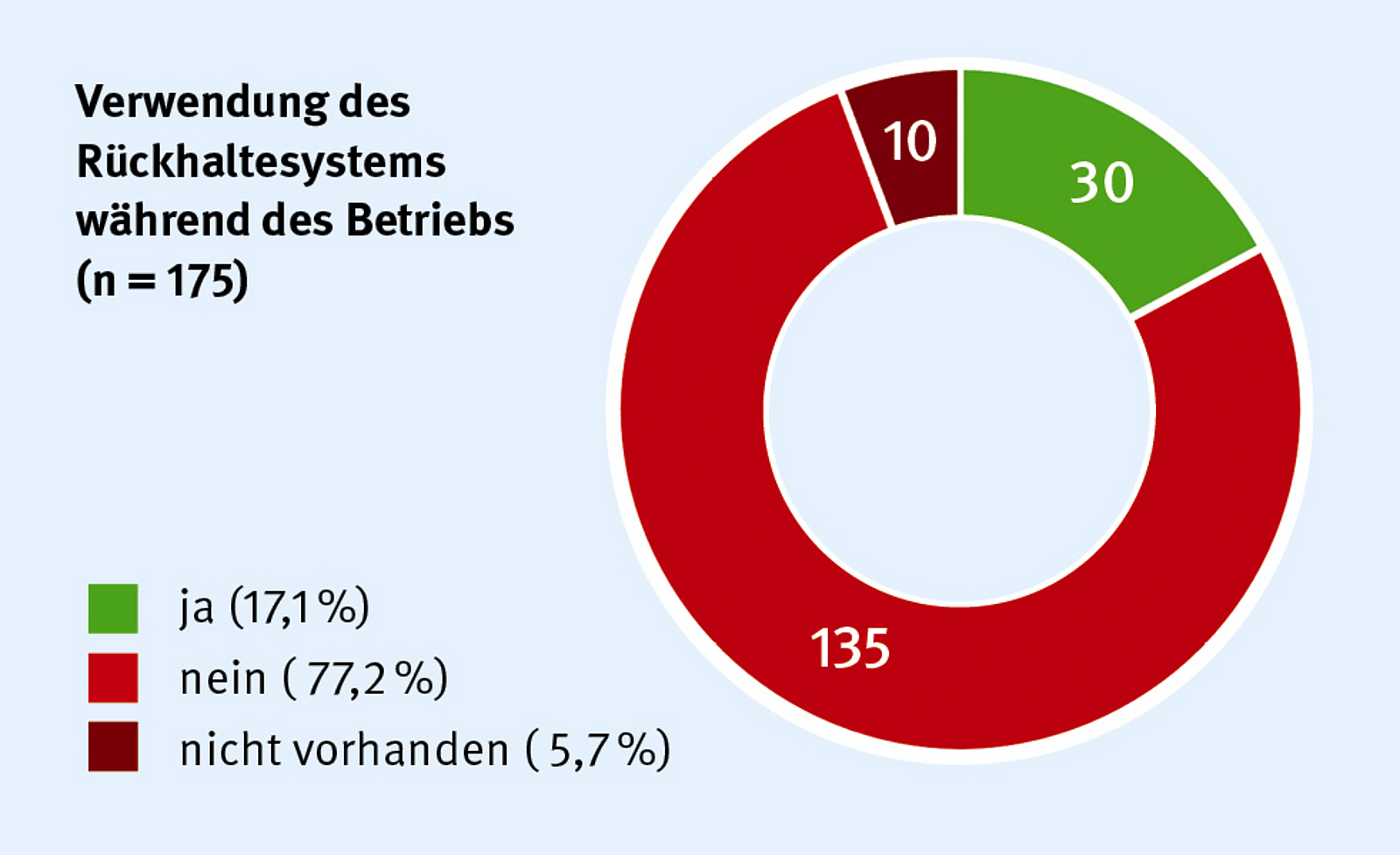 Beinahe 97 % der betrachteten Erdbaumaschinen verfügten über die notwendigen Schutzaufbauten für den Fahrerplatz. In wenigen Einzelfällen wurden die vorhandenen Sicherheitseinrichtungen (oft aus Transport- oder Platzgründen) unzulässigerweise demontiert und vor dem Einsatz nicht wieder angebracht. Die vorhandenen Schutzaufbauten gewährleisten dabei den notwendigen Überlebensraum für die maschinenführende Person im Fall, eines Kipp- oder Umsturzereignisses, wenn diese dabei auf ihrer vorgesehenen Position am Fahrersitz verbleibt. Hierzu werden in der Praxis fast ausschließlich aus einem Beckengurt bestehende Rückhaltesysteme eingesetzt. Die Datenauswertung ergab, dass 94 % der Erdbaumaschinen über einen funktionsfähigen Beckengurt als Rückhaltesystem verfügten. In Einzelfällen fehlte das notwendige Rückhaltesystem oder war defekt, sodass kein sicherer Betrieb gewährleistet war. Während die technischen Voraussetzungen an den eingesetzten Erdbaumaschinen in der Praxis überwiegend gegeben sind, zeigt sich bei der Anwendung und Akzeptanz der technischen Sicherheitseinrichtungen durch die jeweilige maschinenführende Person ein abweichendes Bild. Oft finden diese nur sehr wenig Akzeptanz. Innerhalb der Stichprobe benutzten gerade einmal 17 % die fast ausschließlich aus einem Beckengurt bestehenden Rückhaltesysteme. „Vier von fünf Maschinenführern benutzen bei ihrer täglichen Arbeit mit ihrer Erdbaumaschine das vorhandene Rückhaltesystem nicht.“ Infolgedessen besteht bei eintretenden Kipp- oder Umsturzereignissen keine ausreichende Sicherheit!