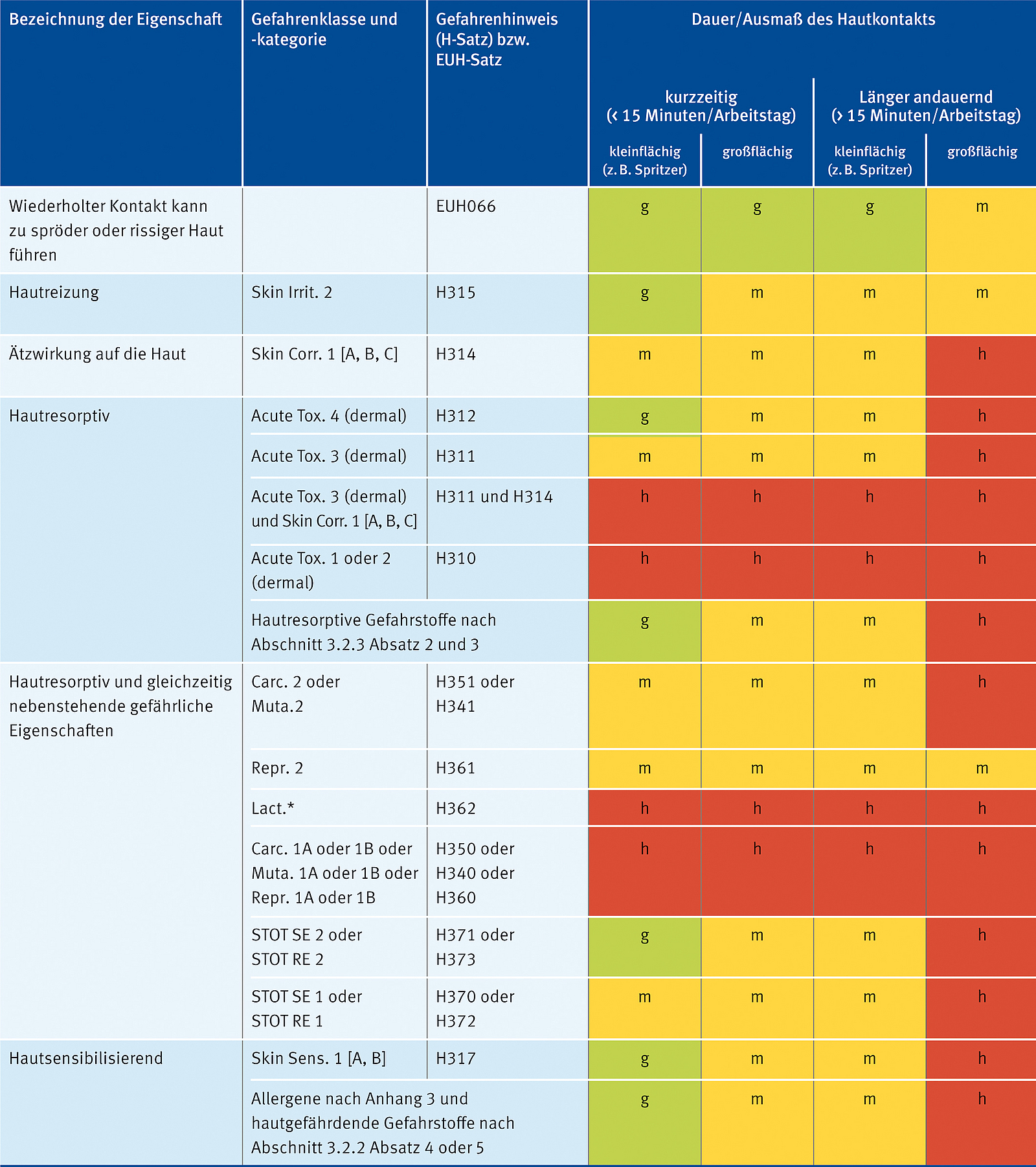 Die TRGS 401 enthält in Abschnitt 3.2 eine detaillierte Beschreibung, bei welchen H-Sätzen von einer Gefährdung der Haut, wie z. B. Reizungen, Ätzungen oder Hautsensibilisierungen, ausgegangen werden muss. Weitere H-Sätze beschreiben hautresorptive Eigenschaften. Der H311 gibt beispielsweise den Hinweis „giftig bei Hautkontakt“. Bei CMR-Stoffen (krebserzeugend, keimzellmutagen oder reproduktionstoxisch) muss bei fehlenden Informationen davon ausgegangen werden, dass eine mögliche Hautresorption vorliegt. Dasselbe gilt für Stoffe mit den H-Sätzen H370 – 373, die auf eine spezifische Zielorgantoxizität hinweisen.