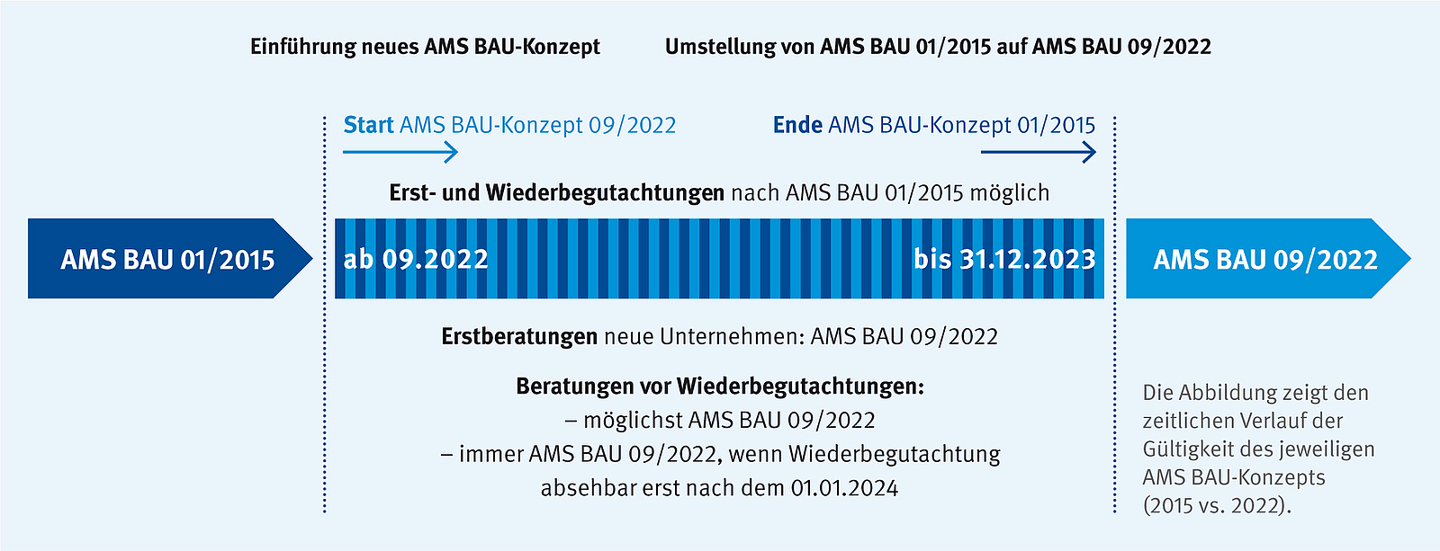 Bis zum 31.12.2023 sind Erst- und Wiederbegutachtungen nach dem alten Konzept (2015) möglich. Wenn absehbar ist, dass eine Begutachtung erst im Jahr 2024 stattfinden wird, aber auch bei Erstberatungen wird nach dem neuen AMS BAU-Konzept (2022) verfahren.