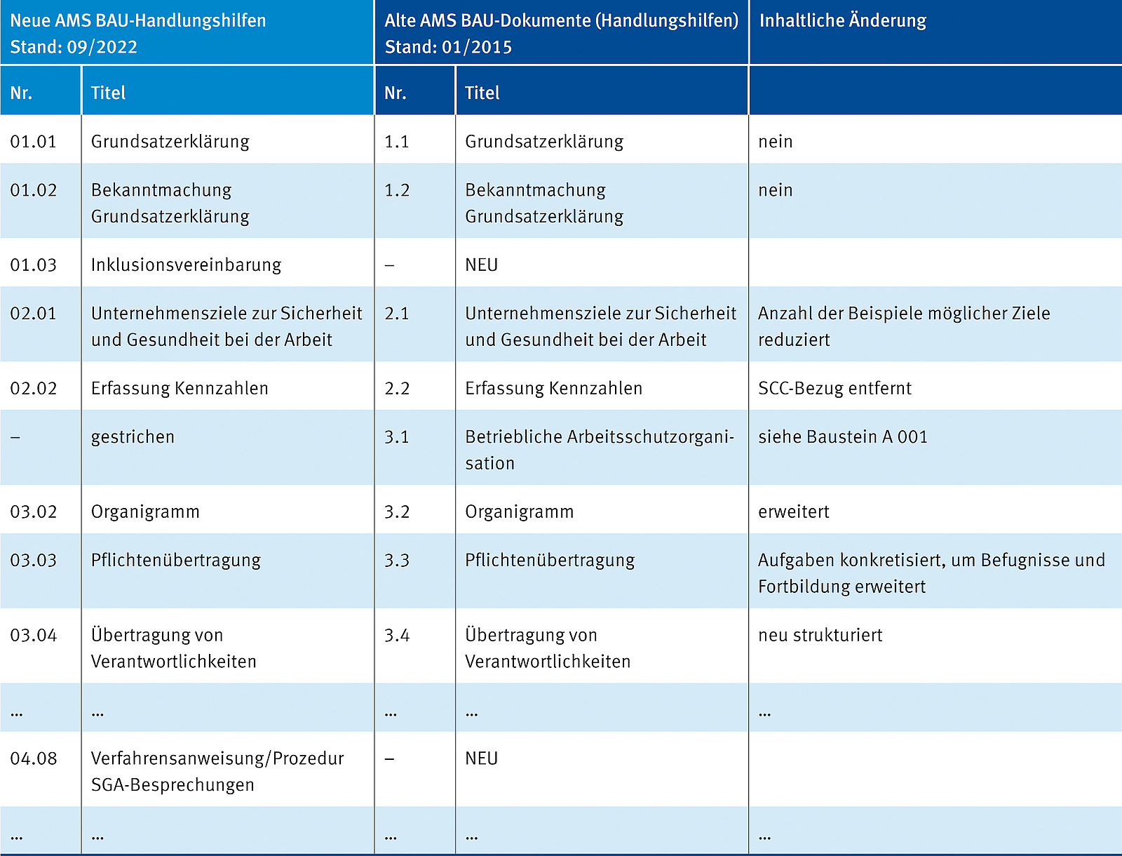 Die Grundstruktur des neuen AMS BAU-Konzepts 2022 einschließlich der bekannten Unterteilung in die 11 Arbeitsschritte entspricht der Version 2015. Der Großteil der neuen Handlungshilfen wurde nur an geänderte gesetzliche Vorgaben angepasst. Einen Ausschnitt der Gegenüberstellung inhaltlicher Änderungen der „alten Dokumente“ und der „neuen Handlungshilfen“ bietet die Abbildung der Handlungshilfe 00_01S (Übersetzungsmatrix). Neu hinzugekommen sind sieben Handlungshilfen, die als Muster für Verfahrensanweisungen/Prozeduren dienen sollen.