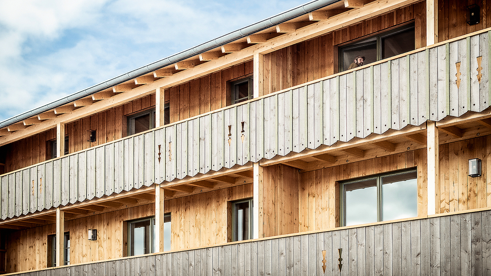 Um einen architektonischen Bezug zum historischen Deichstetterhaus herzustellen, wurde auch das neue Mehrfamilienhaus mit einer Holzverkleidung im alpenländischen Stil ausgestattet, die zusätzlich den Charakter der Holzbauweise betont.