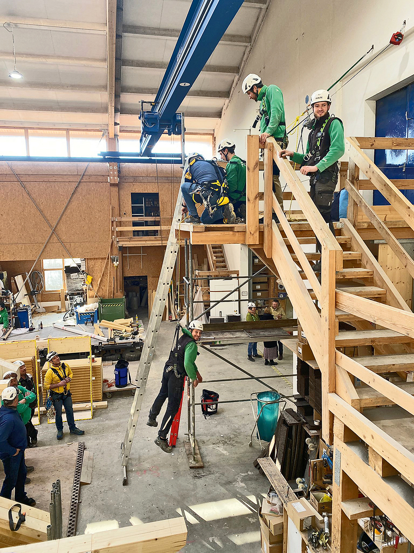 Besonderen Wert legt das Unternehmen auf die Brandschutz- und Höhenrettungsübungen, die für die Beschäftigten angeboten werden. Durch die Vorfertigung der Elemente verkürzt sich zwar die Zeit der Montage, aber sie findet dennoch statt. Für eine sichere und effiziente Montage in der Höhe werden für die Beschäftigten deshalb spezielle Trainings in der Nutzung der PSA (Persönliche Schutzausrüstung) gegen Absturz durchgeführt.