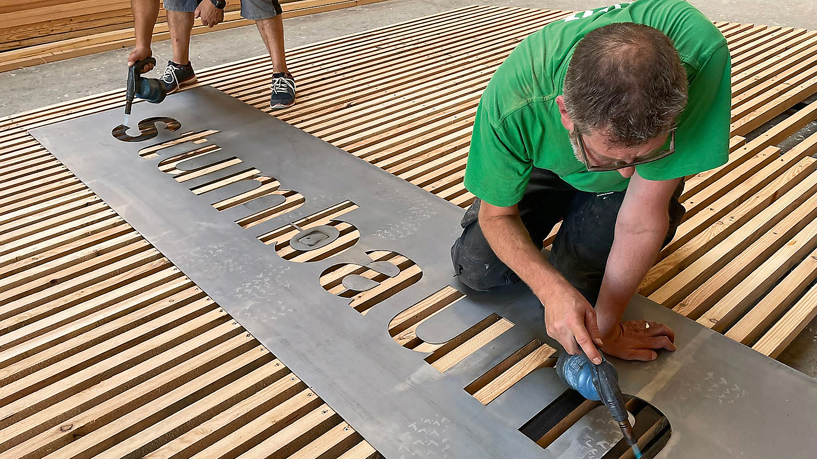 Eine Herausforderung war auch die Gestaltung des Logos, das in die Holzfassade eingebrannt wurde. Das Einbrennen, das auch als Karbonisierung oder Verkohlung von Holz bezeichnet wird, sollte nicht nur die Fassade an dieser Stelle optisch aufwerten, sondern auch für mehr Nachhaltigkeit und Dauerhaftigkeit sorgen. Das gezielte Verkohlen von Holzoberflächen bewirkt, dass sich die Holzzellen verdichten und weniger Wasser absorbieren und so einen natürlichen Schutz vor Schimmelpilzen und dem Eindringen von Insekten, Verwitterung, Fäulnis und Wasser bieten. Karbonisiertes Holz ist länger haltbar und erübrigt zudem eine Behandlung mit chemischen Holzschutzmitteln.