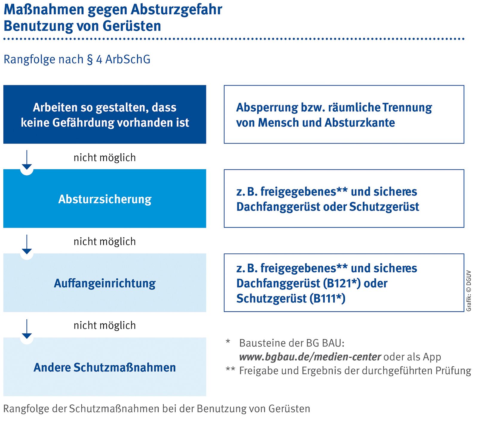 Bei der inhaltlichen Neugestaltung der Informationsschrift wurde prinzipiell die Rangfolge der Schutzmaßnahmen, die sich aus dem § 4 des Arbeitsschutzgesetzes ergibt, berücksichtigt und für die verschiedenen Akteure dargestellt. Die Rangfolge der zu wählenden Schutzmaßnahmen gilt für alle am Bau Beteiligten – auch die Ausschreibenden und Planenden. So stellt die DGUV Information beispielsweise klar, dass auch die Bauherrenseite in der Planungsphase die Rangfolge der Schutzmaßnahmen zu berücksichtigen hat und die Arbeiten möglichst so gestalten (lassen) muss, dass keine Gefährdung vorhanden ist – also z. B. keine Absturzkante besteht. Auch auf die in der TRBS 2121-1 formulierten Anforderungen bezüglich der Art und Menge der Zugänge werden Planende hingewiesen: alle 50 m sind Zugänge in Form von Aufzügen, Transportbühnen oder Treppen (ab 5 m Aufstiegshöhe) vorzusehen. Für die Ausführungsphase sind auch der Bauherrenvertretung Hinweise an die Hand gegeben, um einen reibungslosen, unfallfreien Bauablauf zu gewährleisten. So wird speziell die Verkehrssicherungspflicht der von den Auftraggebern eingesetzten Person oder der bauleitenden Person thematisiert und damit auf die besondere Verantwortung hingewiesen.