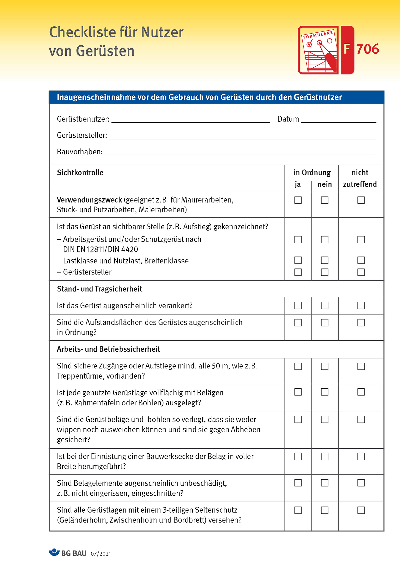 Das Muster der Checkliste für Gerüstnutzer wurde nicht wieder aufgenommen, ist aber als Baustein F706 unter www.bgbau.de/medien-center verfügbar. Diese Checkliste ist eine Hilfestellung für qualifizierte Personen nach TRBS 2121-1, die Gerüste vor der Benutzung auf offensichtliche Mängel und Funktionalität kontrollieren. Ohne diese, in der Regel arbeitstägliche Kontrolle darf ein Gerüst von Gerüstnutzern nicht betreten werden. Diese Forderung der TRBS 2121-1 ergibt sich aus den Anforderungen der Betriebssicherheitsverordnung (§ 4 Absatz 5 Satz 3) und hat den Sinn, die Funktion des Gerüsts als Arbeitsmittel und/oder Absturzsicherungsmaßnahme in Augenschein zu nehmen, bevor darauf gearbeitet wird. Mithilfe dieser Checkliste kann nichts vergessen werden.