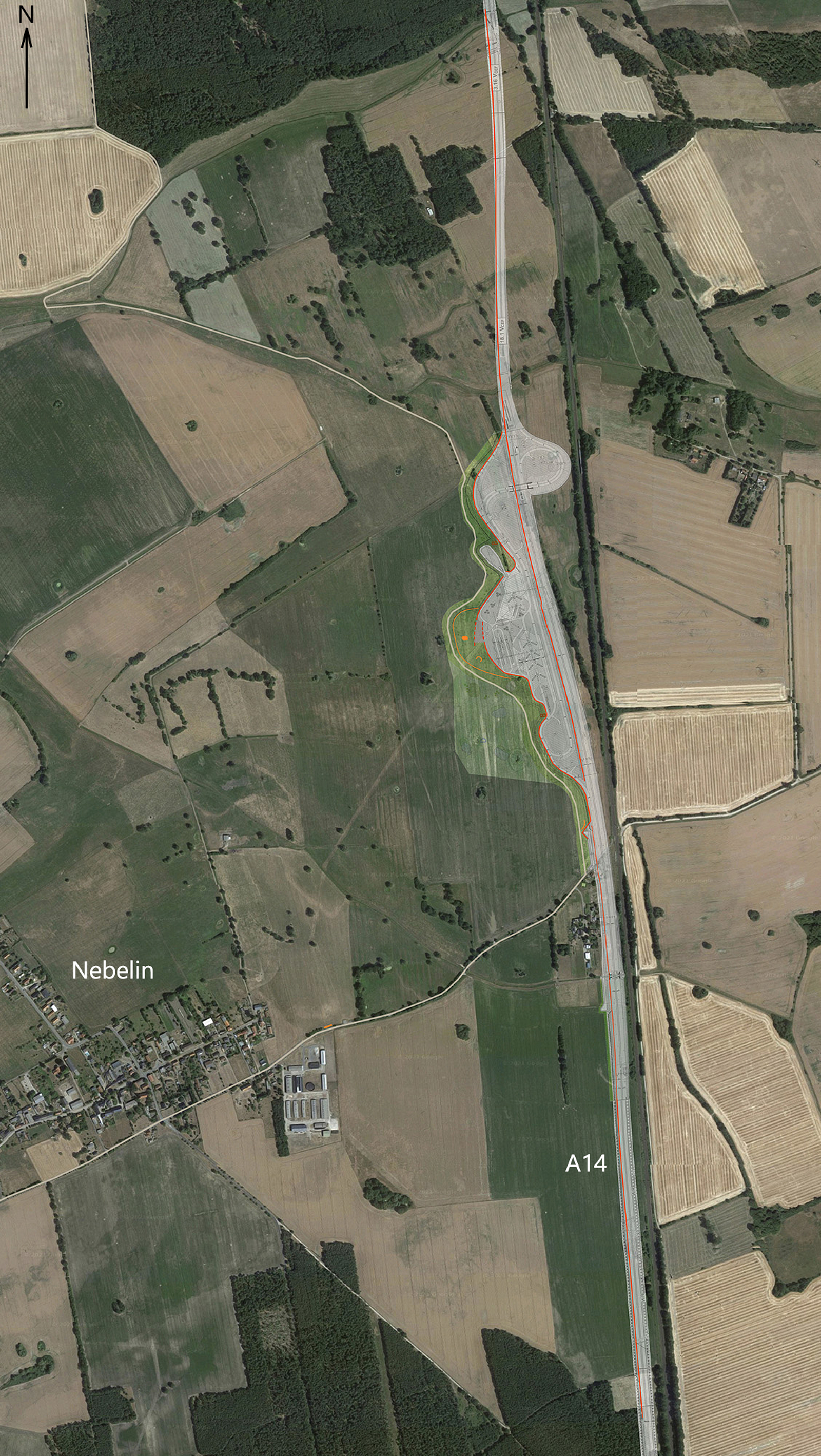 Beim zweiten Pilotprojekt geht es um eine „grüne“ Autobahn im ländlichen Raum. In Brandenburg soll die neue Autobahn A 14 beim Dorf Nebelin ein Biosphärenreservat durchschneiden, weshalb besondere Umweltschutzauflagen einzuhalten sind. Eine Machbarkeitsstudie schlägt nun konkret den Einsatz von Lehm in diverser Form als Stampflehm, aber auch als sogenannter Wellerlehm (Mischung mit Stroh, Heidekraut und Pflanzenfasern) vor – sowohl für die Lärmschutzwand als auch für die Tank- und Raststätte.