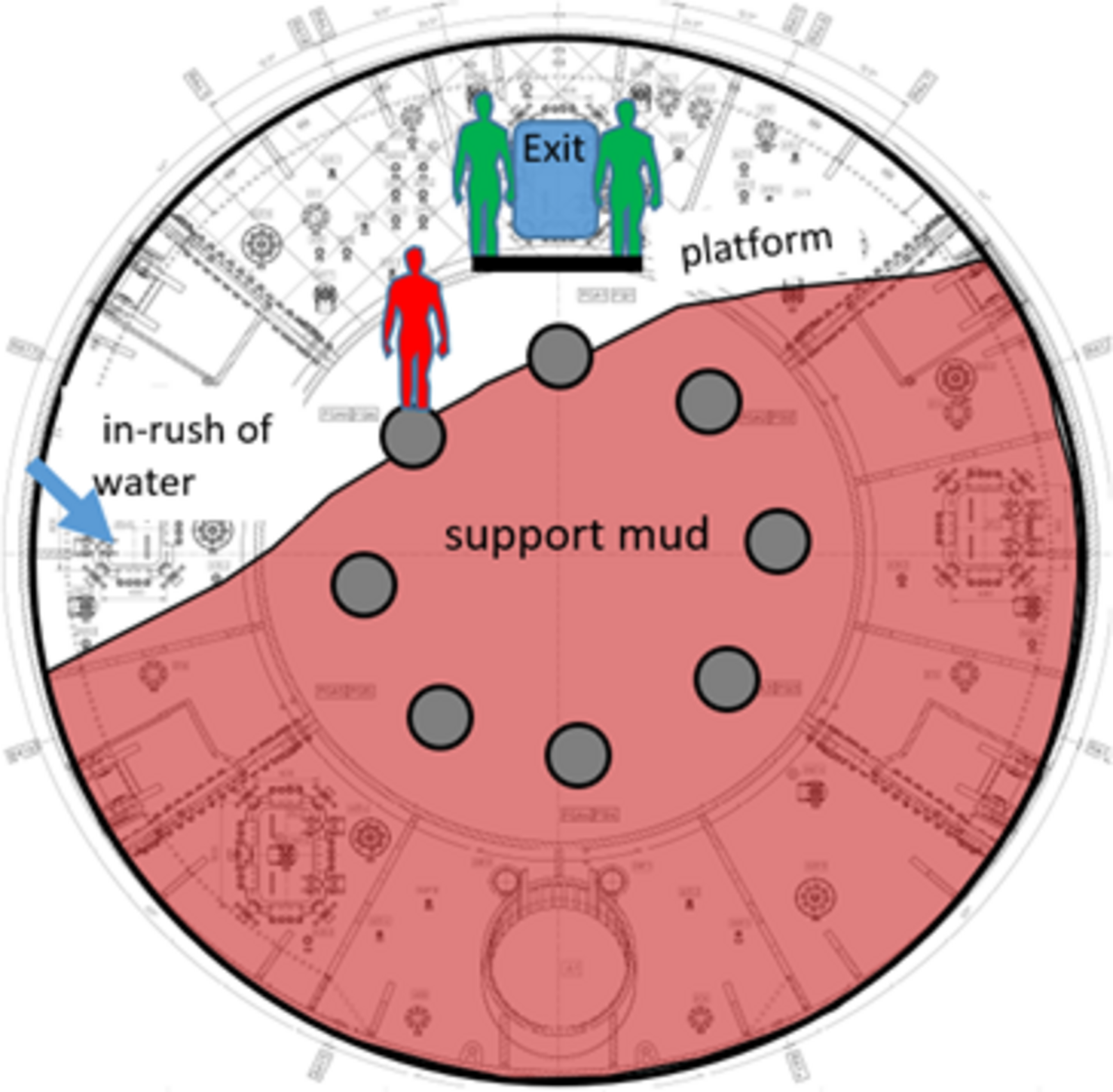 Der Einstieg verlief zunächst planmäßig. Trotz Druckluftstützung war ein Wasserzutritt im unteren Bereich hörbar. Da aufgrund der Sande und Kiese Materialaustritte und die Verschlechterung der Ortsbruststabilität möglich erschienen, war eine Beurteilung des Wasserzulaufs hinsichtlich weiterer Drucklufteinstiege erforderlich. Beim Abstieg eines Mitarbeiters kam es ca. 1,6 m unterhalb der Tür zur Druckluftschleuse zur Intoxikation.
