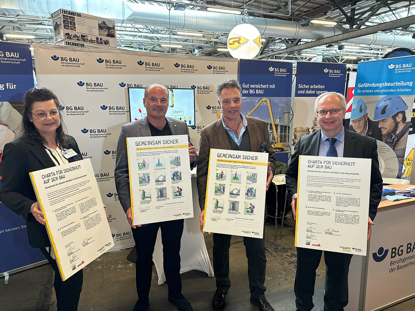 v. l. n. r.: Peggy Ruchatz (BG BAU ), Johannes Schlenter (Vorstandsvorsitzender DA), Bernd Pagel (BG BAU) und Andreas Pocha (Geschäftsführer DA) mit der unterzeichneten „Charta für Sicherheit auf dem Bau“ und dem Bekenntnis „Gemeinsam sicher“