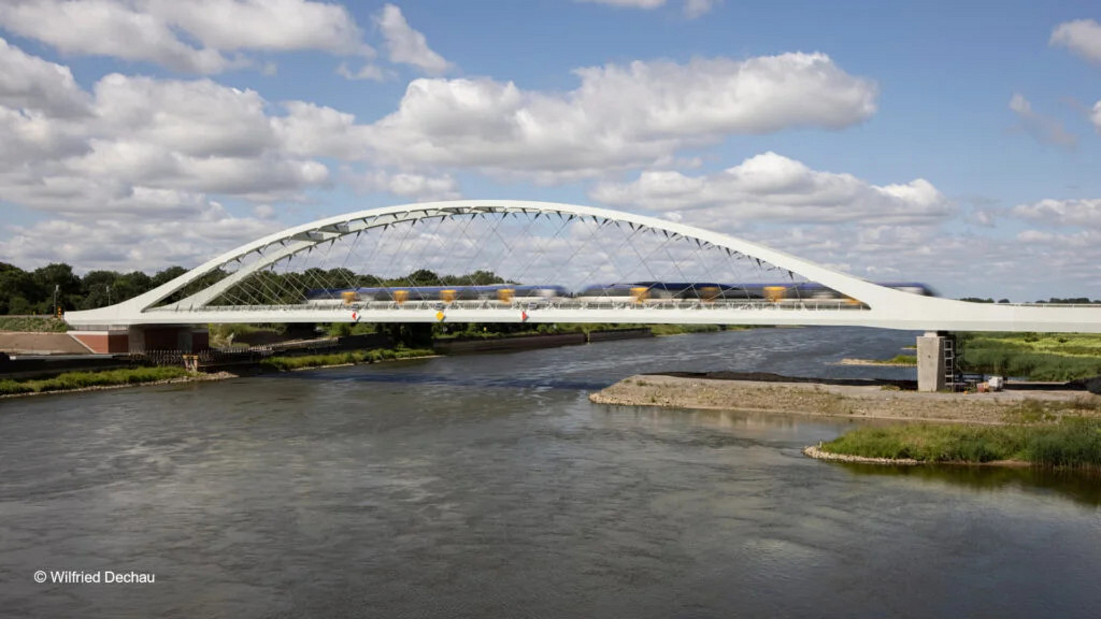 Die neue Oderbrücke ist eine zweigleisige Netzwerkbogenbrücke in Verbundbauweise mit vorgespannten Zuggliedern aus Carbon. Obwohl Carbonhänger schon im Einsatz sind, stellt die Oderbrücke die weltweit erste Eisenbahnbrücke mit dieser Innovation dar.