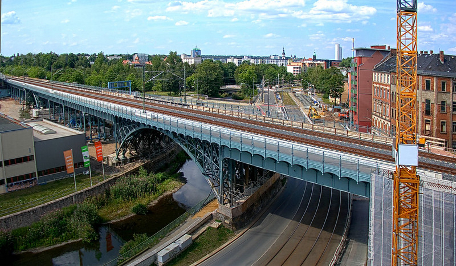 Zwischen 1901 und 1909 aus genietetem Flussstahl errichtet, überführte das Chemnitzer Viadukt ursprünglich vier parallele Gleise über den Fluss Chemnitz. Für die Modernisierung entwickelten die Ingenieure eine Mischvariante, die die zurückhaltende Integration einer neuen Verbundkonstruktionen des Fahrwegs auf den beiden inneren Überbauten ermöglicht.