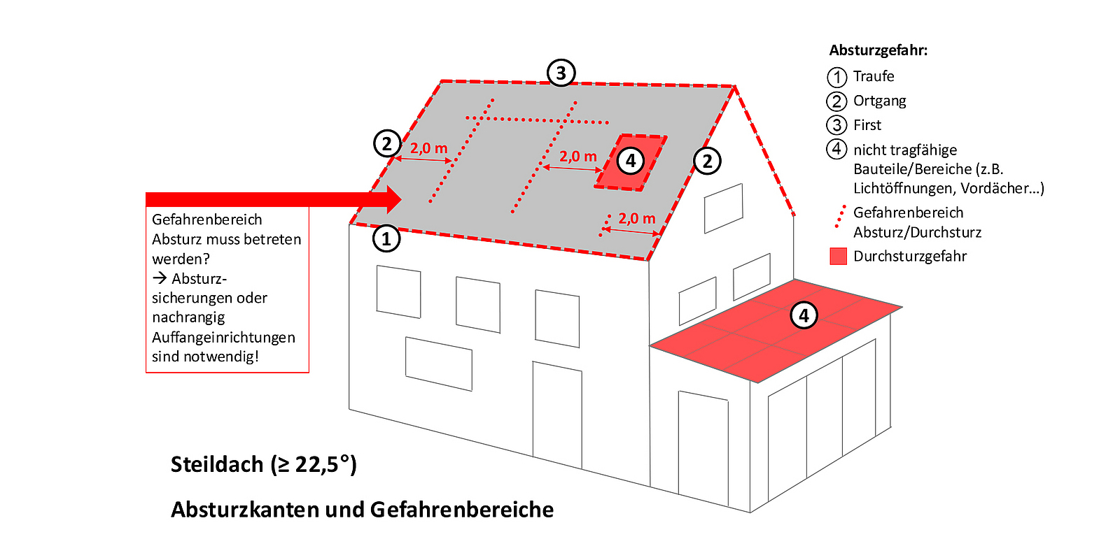 Der Gefahrenbereich Absturz erstreckt sich bis 2,00 m vor der Absturzkante am Ortgang. Innerhalb dieses Gefahrenbereichs darf sich ausschließlich aufgehalten und gearbeitet werden, wenn Maßnahmen gegen Absturz getroffen sind. In Traufrichtung ist bei Dächern mit > 22,5° Dachneigung eine Auffangeinrichtung als Absturzsicherung notwendig. Prinzipiell sind kollektiv-technische Schutzmaßnahmen den individuellen (z. B. PSAgA) vorzuziehen. Individuelle Schutzmaßnahmen sollen nur zur Anwendung kommen, wenn kollektiv-technische Schutzmaßnahmen aus konstruktiver Sicht nicht umgesetzt werden können. Liegen Arbeitsbereiche außerhalb des Gefahrenbereichs, also mehr als 2,00 m von der Absturzkante am Ortgang entfernt, kann der Gefahrenbereich nachrangig zu Absturzsicherungen abgesperrt und deutlich kenntlich gemacht werden. Hierfür können Ketten, Seile oder Bretter zum Einsatz kommen. Eine Auffangeinrichtung (meist an der Traufe) ist bei Steildächern i. d. R. unerlässlich. Tödliche Unfallgefahr besteht bei Dachoberlichtern und nicht durchtrittsicheren Bauteilen. Hier sind insbesondere Lichtplatten, ungesicherte Lichtkuppeln und andere nicht durchsturzsichere Lichtelemente hauptursächlich für tödlich endende Durchsturzunfälle.
