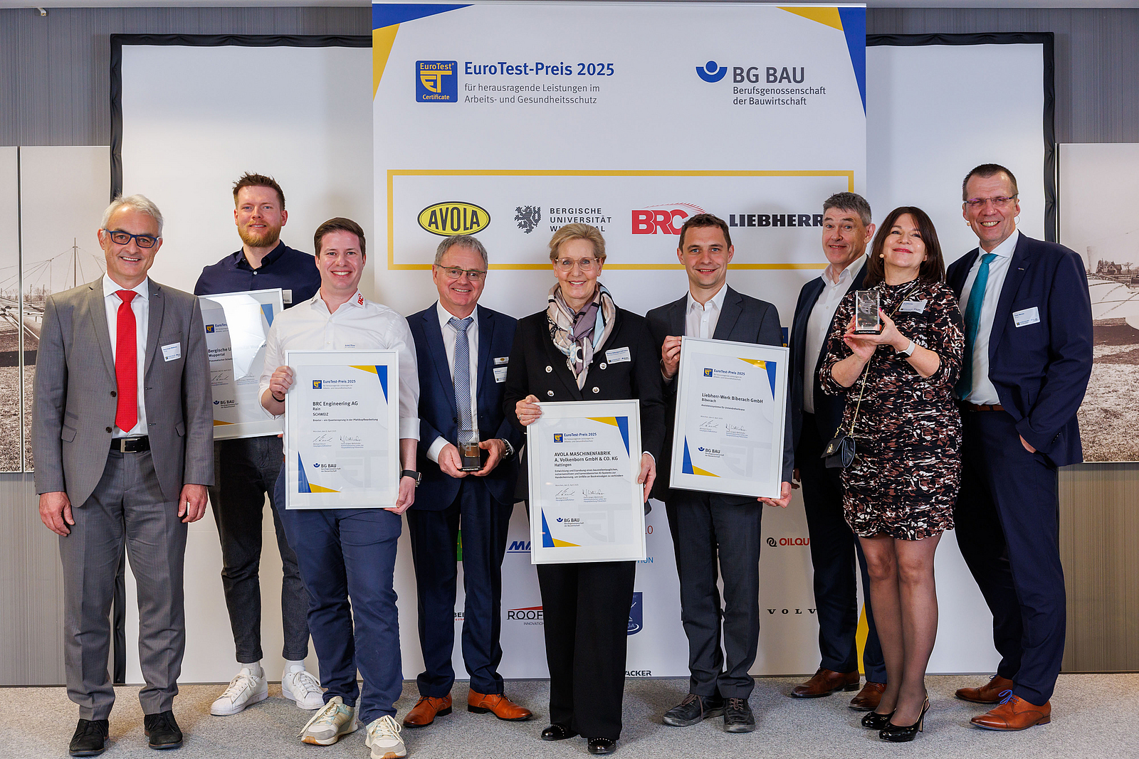 Vier Preisträger – die AVOLA Maschinenfabrik A. Volkenborn GmbH & Co. KG, die Bergische Universität Wuppertal, die BRC Engineering AG und die Liebherr-Werk Biberach GmbH – überzeugten die Jury mit innovativen Produkten, die für mehr Arbeitssicherheit am Bau sorgen. Die Preisverleihung fand am 8. April 2025 im Rahmen der Weltleitmesse bauma in München statt.