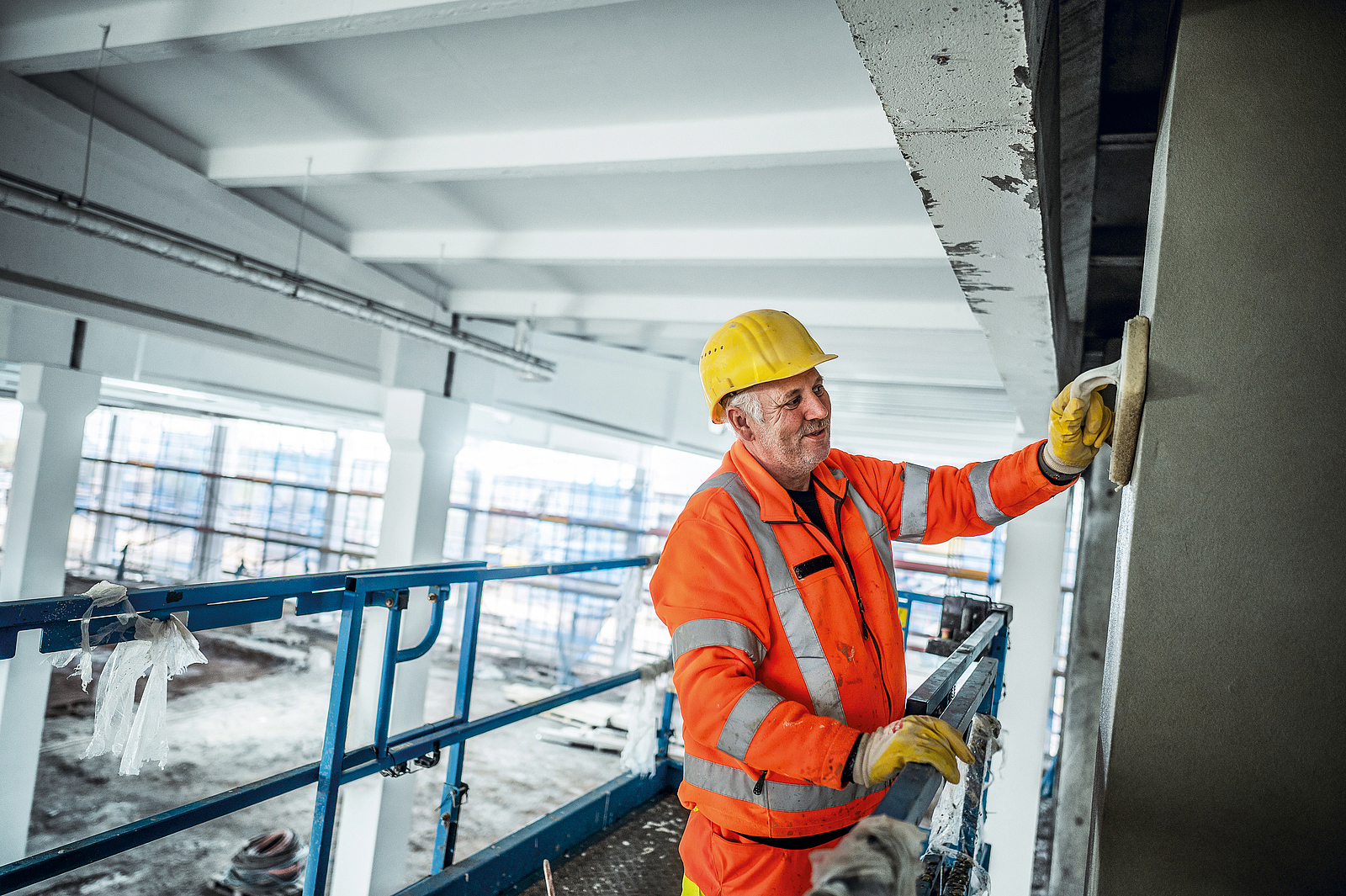 Neben den Hallenstützen galt ein besonderes Augenmerk der Sanierung der Hallendecke. Auf 1.300 m² Fläche wurde der Untergrund mittels Feststoffstrahlen vorbereitet, der Korrosionsschutz für die freigelegte Bewehrung aufgetragen sowie eine Reprofilierung von Schadstellen vorgenommen. Den Abschluss bildeten der Spachtelauftrag sowie der Oberflächenschutzanstrich.