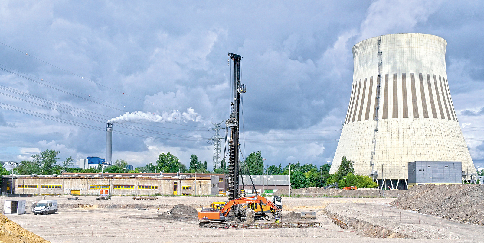 Für die Pfahlgründung der neuen Anlagen müssen Bohrungen vorgenommen werden. Im Hintergrund der Kühlturm des Kraftwerks Reuter-West.