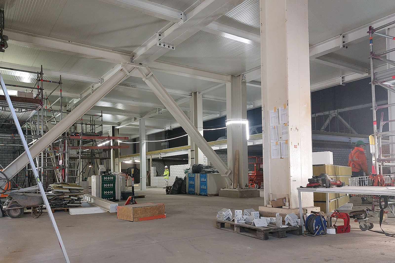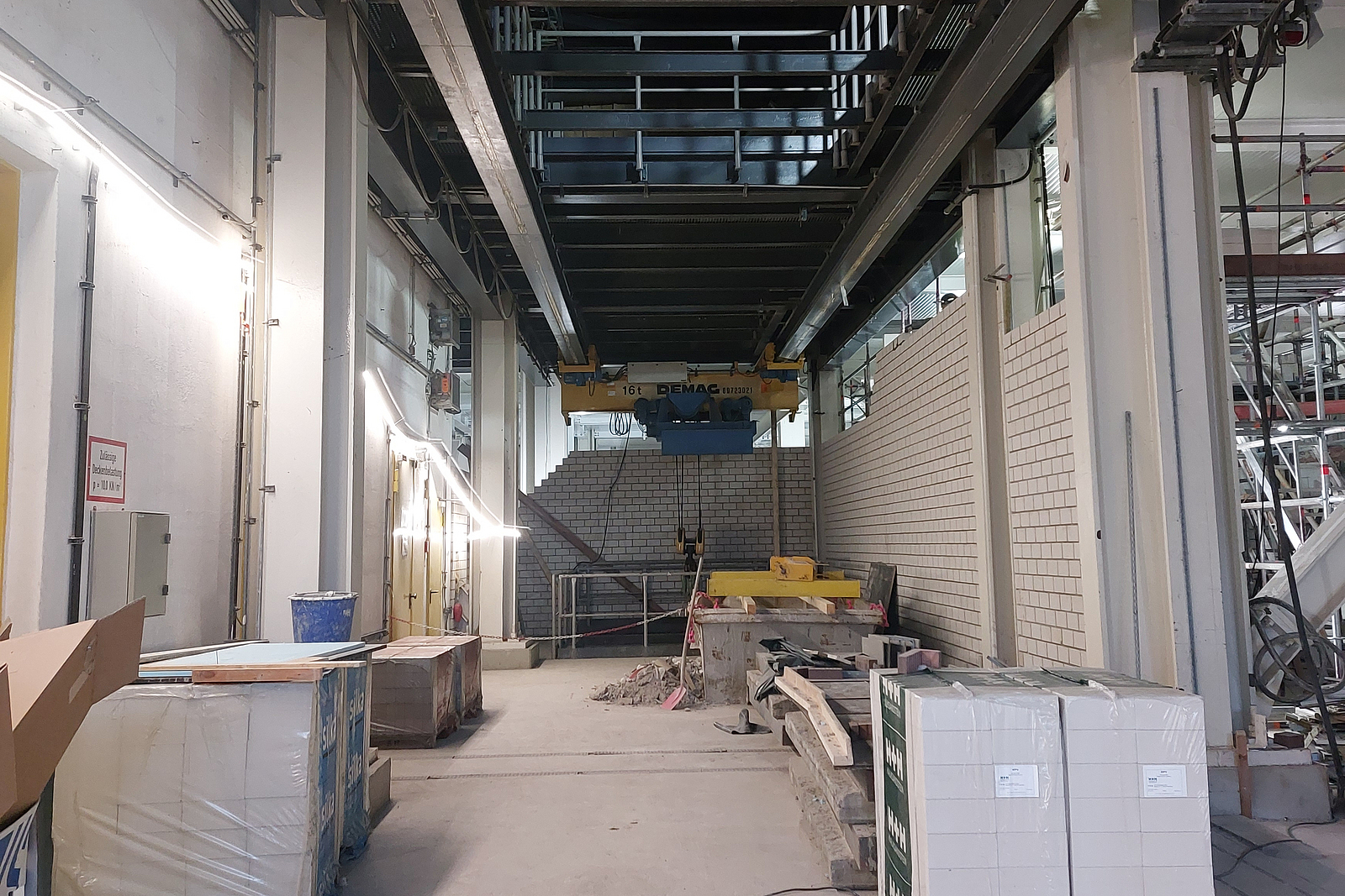 Hinter dem neuen Campus steht das beeindruckende Klinkergebäude der vormaligen Rauchgasreinigungsanlage. Es ist im Umbau begriffen. Nach der Demontage aller Anlagenteile und der Entkernung der Hallen mit den bis zu 15 m hohen Decken sind auf Stahlbauskeletten neue Etagen entstanden. Dort ziehen Maurer die Wände aus Kalksandsteinen für Meisterbüros und Werkstätten ein. Von den Entkernungsarbeiten bis zur Übergabe begleitet Jochen Firzlaff als Fachkraft für Arbeitssicherheit alle Tätigkeiten auf der Baustelle. Zwei Tage die Woche ist er vor Ort und betreut alle Beteiligten bei der Ausführung.