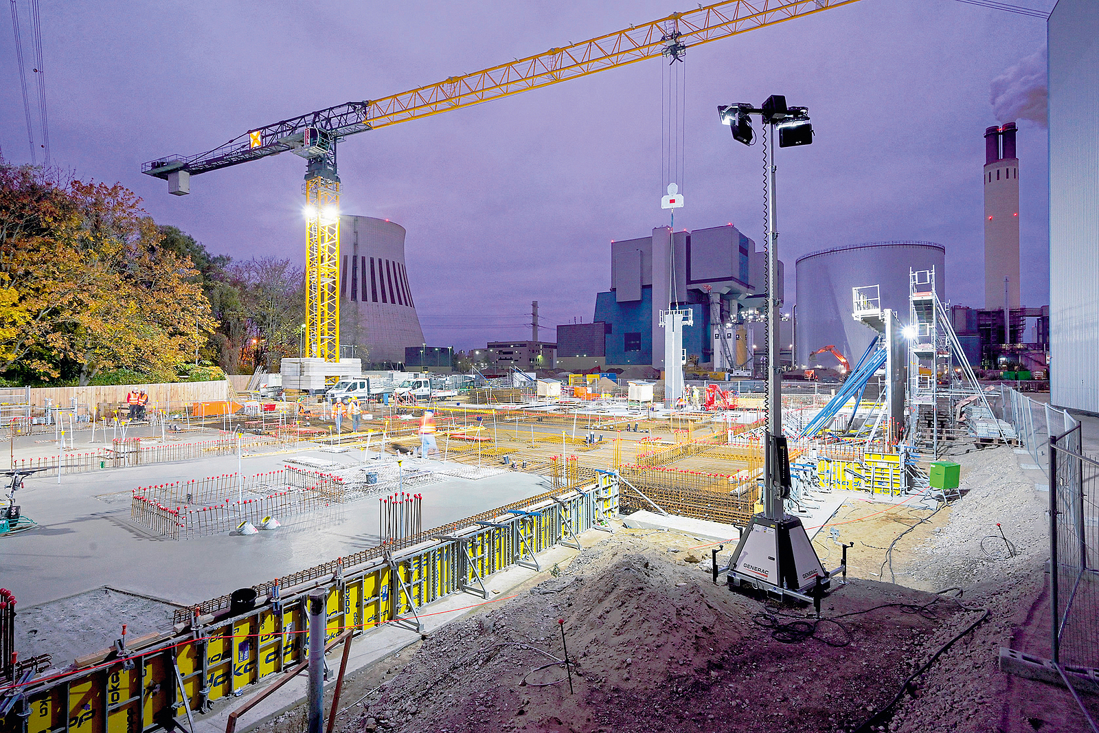 Rund um die Uhr wird an den neuen Anlagen gebaut, wie der Bodenplatte für das zukünftige Turbinengebäude.