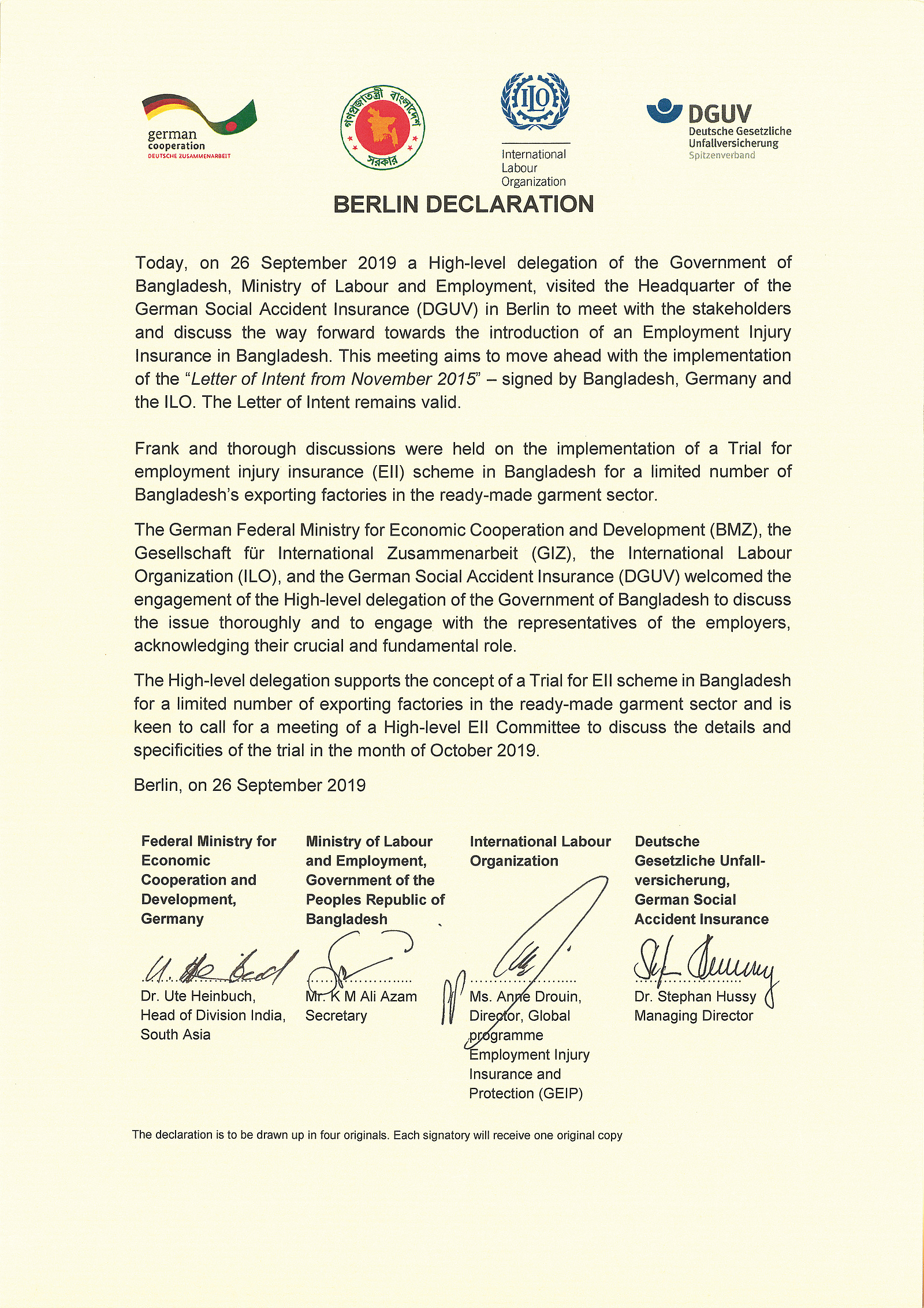 Die Deutsche Gesetzliche Unfallversicherung (DGUV) unterstützt seit einigen Jahren gemeinsam mit der Berufsgenossenschaft der Bauwirtschaft (BG BAU), der Berufsgenossenschaft Energie Textil Elektro Medienerzeugnisse (BG ETEM) und der Gesellschaft für internationale Zusammenarbeit (GIZ) Bangladesch – neben weiteren Ländern in Afrika und Asien – dabei, die Arbeitsbedingungen in den Fabriken vor Ort zu verbessern und die nationalen Standards zur Vorbeugung und Behandlung von Berufskrankheiten, zur Vermeidung von Unfällen und deren Folgen sowie zur Verbesserung der Arbeitsbedingungen – insbesondere in den Textilfabriken – weiterzuentwickeln.