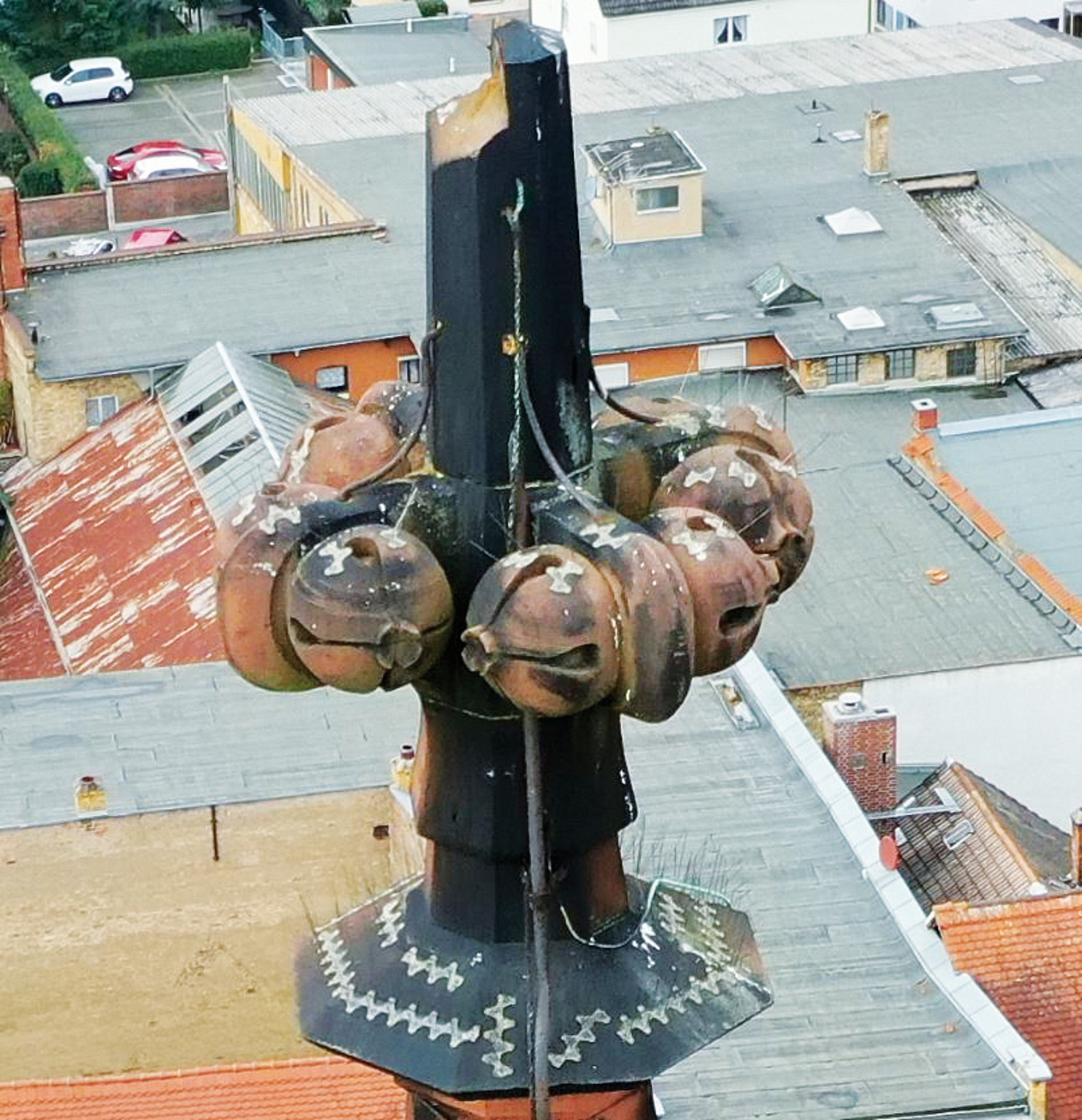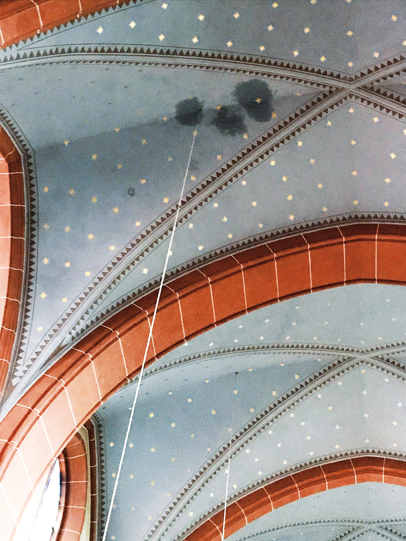 Das Dach der Stadtkirche Langen, auch bekannt als „Dom der Dreieich“ [2], wurde vor einiger Zeit notdürftig repariert, doch das Wasser sucht sich bekanntlich seinen Weg. So kam es, dass das Gewölbe der Kirche durch Wassereinsickerungen bereits sichtbar beschädigt wurde. Bei einem heftigen Unwetter im Spätsommer 2019 brach dann zusätzlich noch die Kirchturmspitze partiell ab.