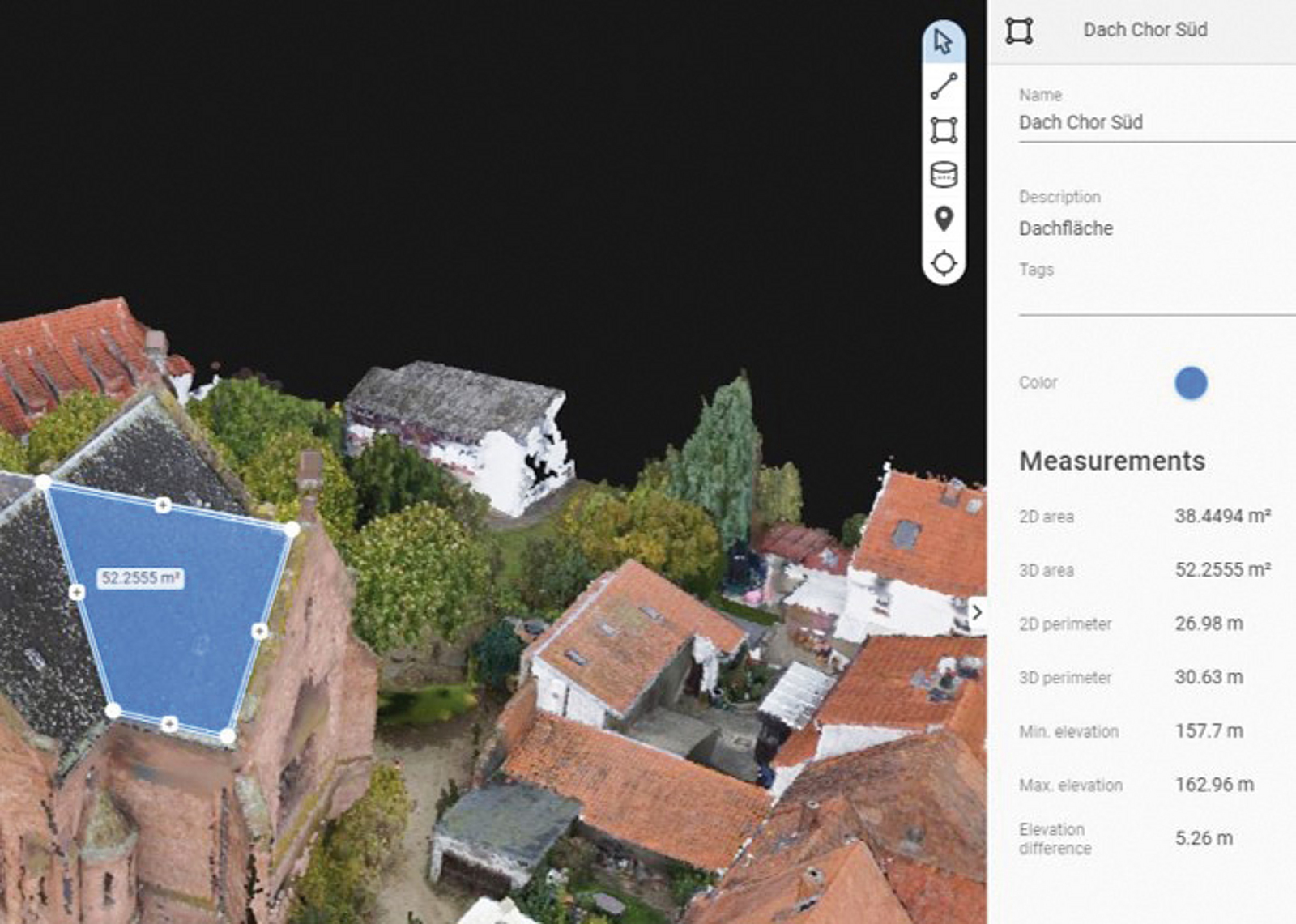 Zeitlich nachgelagert erfolgte die Berechnung der weiteren digitalen Ausgabeprodukte (digitales Gelände-/Oberflächenmodell, 3-D-Modell und Punktwolke) für weitere Vermessungen (Strecken, Flächen, Volumina, Höhenprofil) und das Setzen von Inspektionspunkten. Inspektionspunkte zeigen alle Aufnahmen an, die diesen speziellen Punkt des Bauwerks beinhalten.