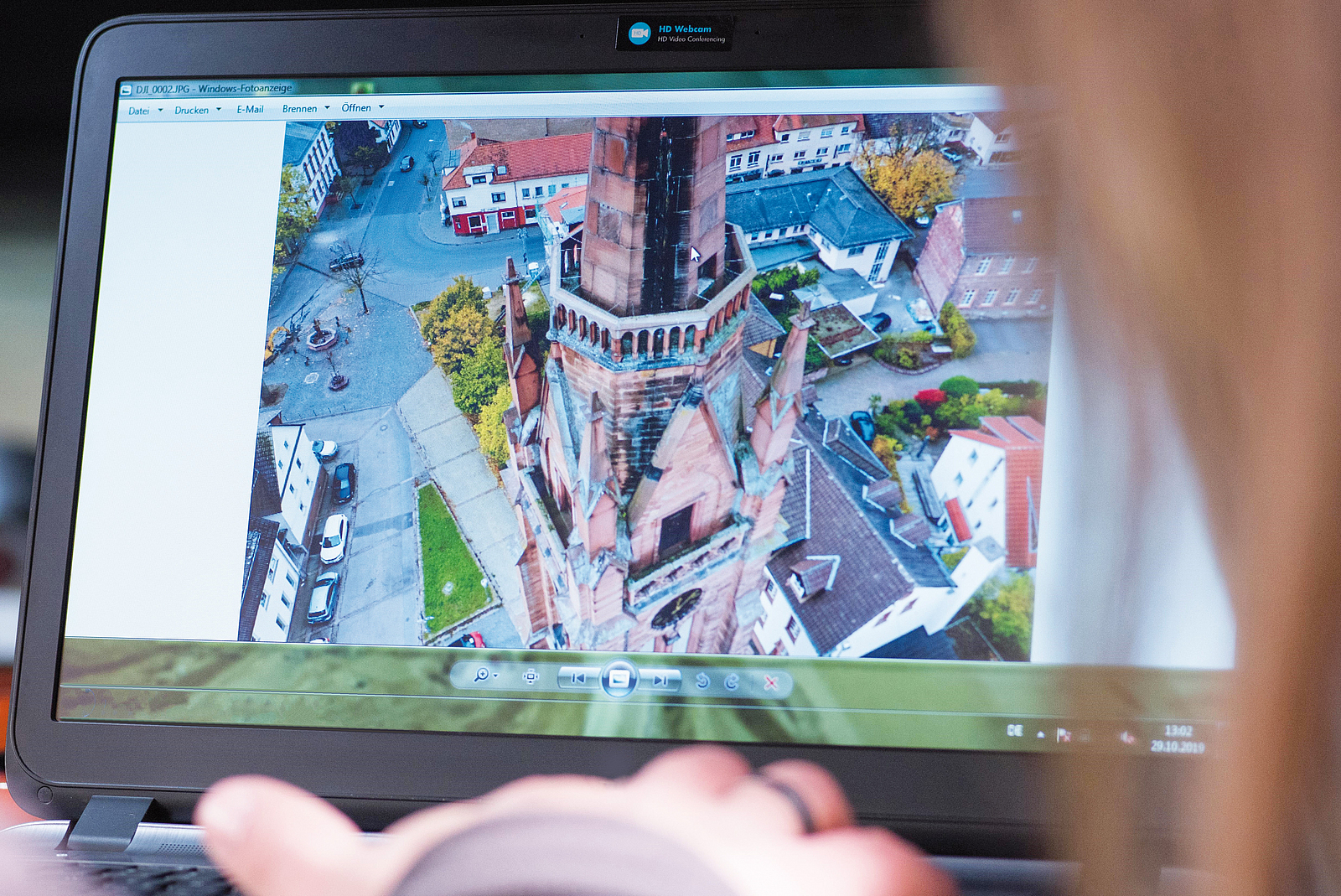 Zwischen den einzelnen Flügen, spätestens jedoch vor Beginn der Detailflüge, wurden die bereits aufgenommenen Luftaufnahmen vor Ort auf einem größeren Monitor zusammen mit dem Architektenteam, das der Befliegung beiwohnte, ausgewertet. So ließen sich direkt vor Ort weitere Inspektionsschwerpunkte setzen, die sich aus dem ersten Sichten des Bildmaterials ergaben. Bei der Begutachtung der Stadtkirche Langen durch Drohneneinsatz wurde deutlich, dass es sinnvoll ist, die Sanierungsmaßnahmen zu erweitern. Die Aufnahmen der oberen Kirchturmfassaden zeigten partiell Verfärbungen des oberrheinischen Sandsteins und bisher den Architekten unbekannte Sandsteinbearbeitung. Ohne die Luftaufnahmen wären diese Punkte durch das „Planungsraster“ der Sanierung gefallen, ebenso die Entfernung des Bewuchses hinter den Fialen. Die Aufnahmen der Bruchkante der Kirchturmspitze waren ebenfalls beeindruckend. Leider war es nicht möglich, zu dem Termin einen Steinmetz hinzuzuziehen, um direkt eine erste Einschätzung zu den bisher unbekannten Details zu erhalten. Es ist jedoch möglich, die Aufnahmen einem Steinmetz zur Kosteneinschätzung hinterher digital zur Verfügung zu stellen.