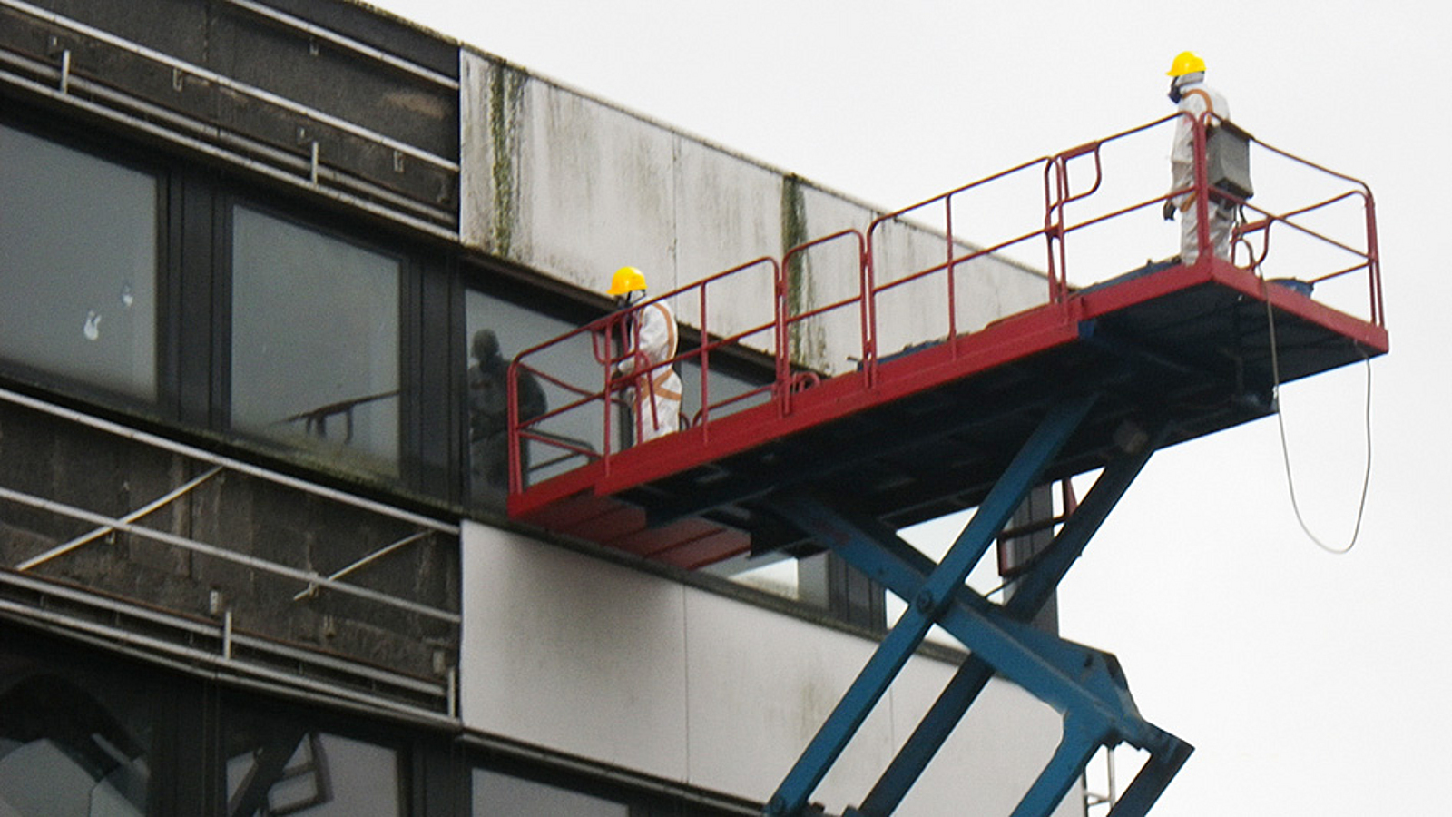 Beim Ausbau der Asbestzementfassadenplatten am Verwaltungsgebäude musste neben den Bestimmungen der TRGS 519 ebenfalls ein besonderes Augenmerk auf die Absturzsicherung gelegt werden, da der Ausbau von einer Hebebühne aus erfolgte.