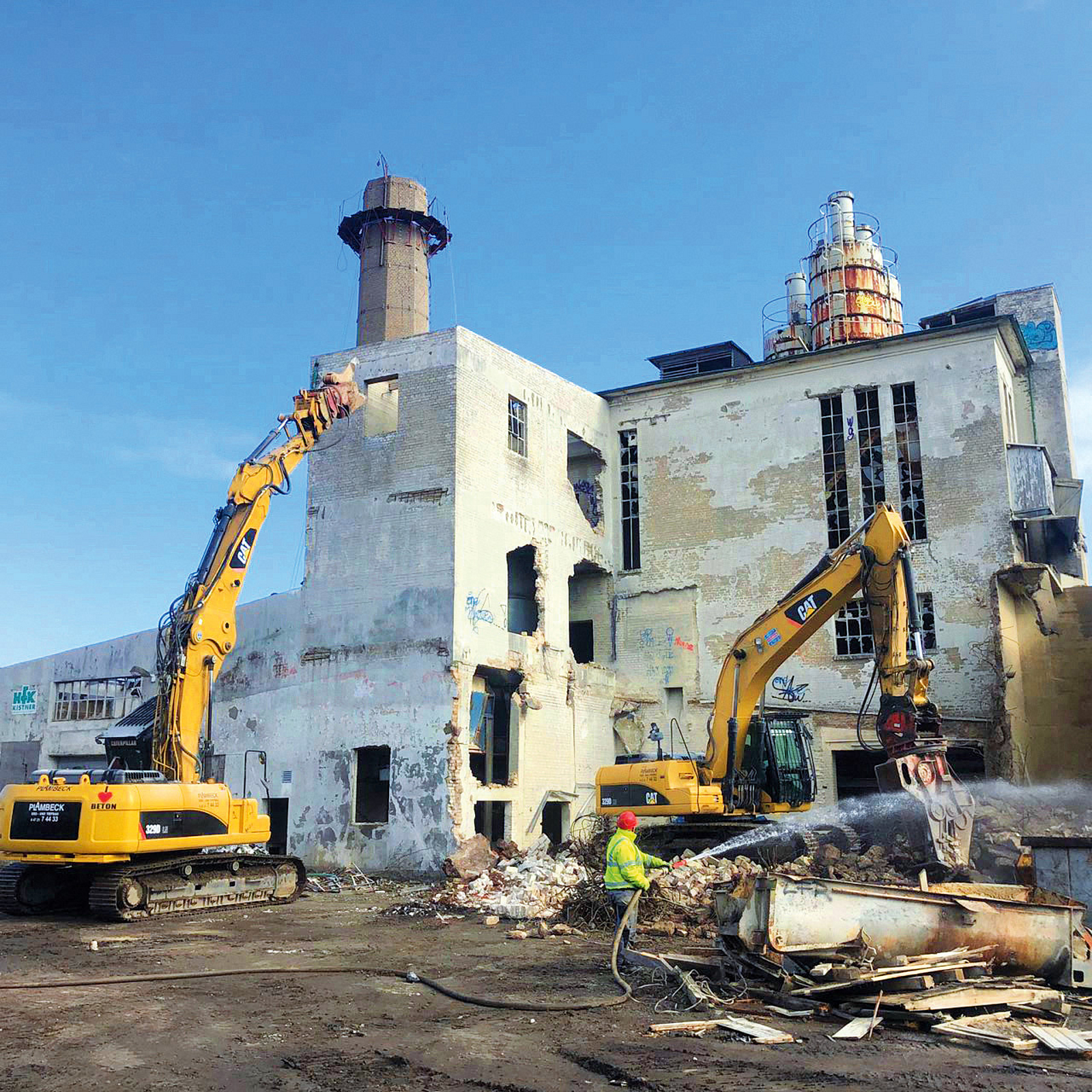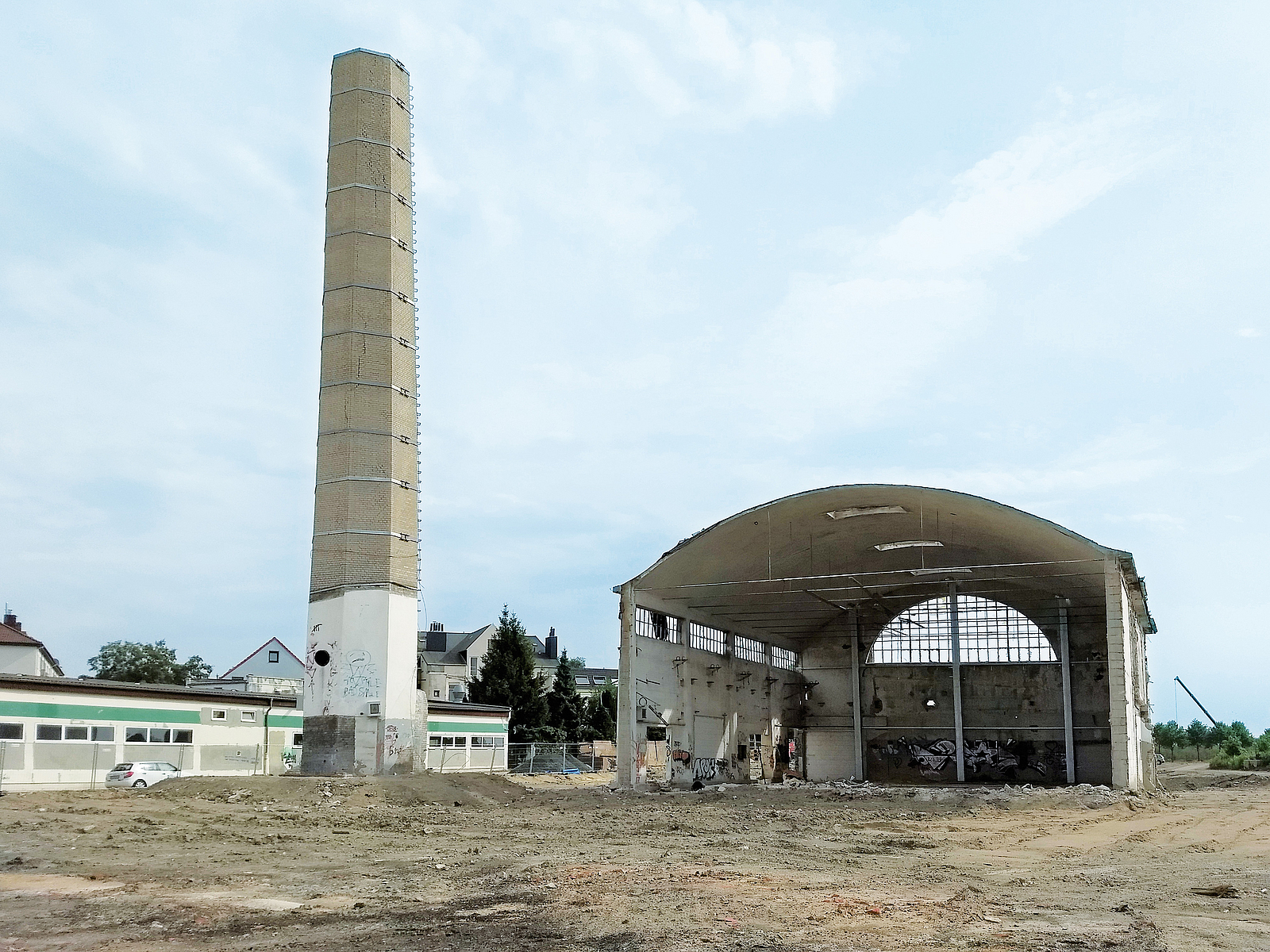 Nach Entkernung, Sanierung und teilweiser Ertüchtigung erfolgte der maschinelle Abbruch. Besonders der Rückbau der abzubrechenden Gebäudeteile der Kalksandsteinfabrik sowie um den Schornstein herum musste erschütterungsarm und z. T. händisch erfolgen.