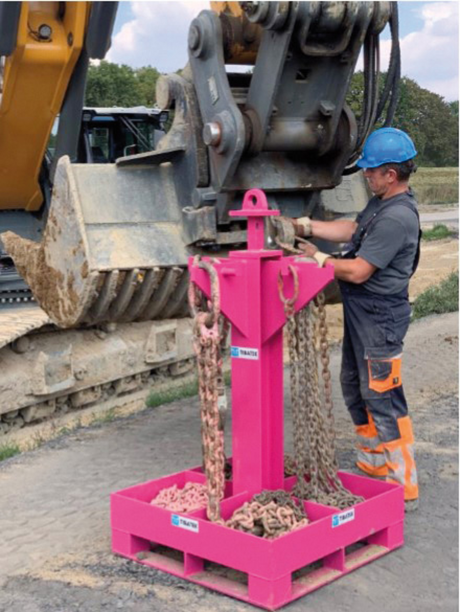 Gerade im Tiefbau kommen Anschlagmittel von hoher Tragfähigkeit und Stabilität häufig zum Einsatz. Hin und wieder werden diese Arbeitsmittel in Materialcontainern oder im Außenbereich nachlässig nach dem Haufenprinzip gelagert. Die Folge sind lange „Suchzeiten“ im Gewirr eines Containers, bis sie letztendlich zum Einsatz am Hebezeug als Anschlagmittel verwendet werden können. Aus dieser Erkenntnis heraus entstand der Kettenständer – Diebstahlsicherung inklusive! Wie bei vielen anderen Verbesserungen im Arbeitsschutz ergab sich auch in diesem Fall nicht nur ein Zugewinn an Sicherheit, sondern auch zusätzlich ergonomische und wirtschaftliche Vorteile. Kein Suchen, kein Bücken, Stolpern und Stürzen mehr – eine Win-win-Situation für alle Beteiligten.