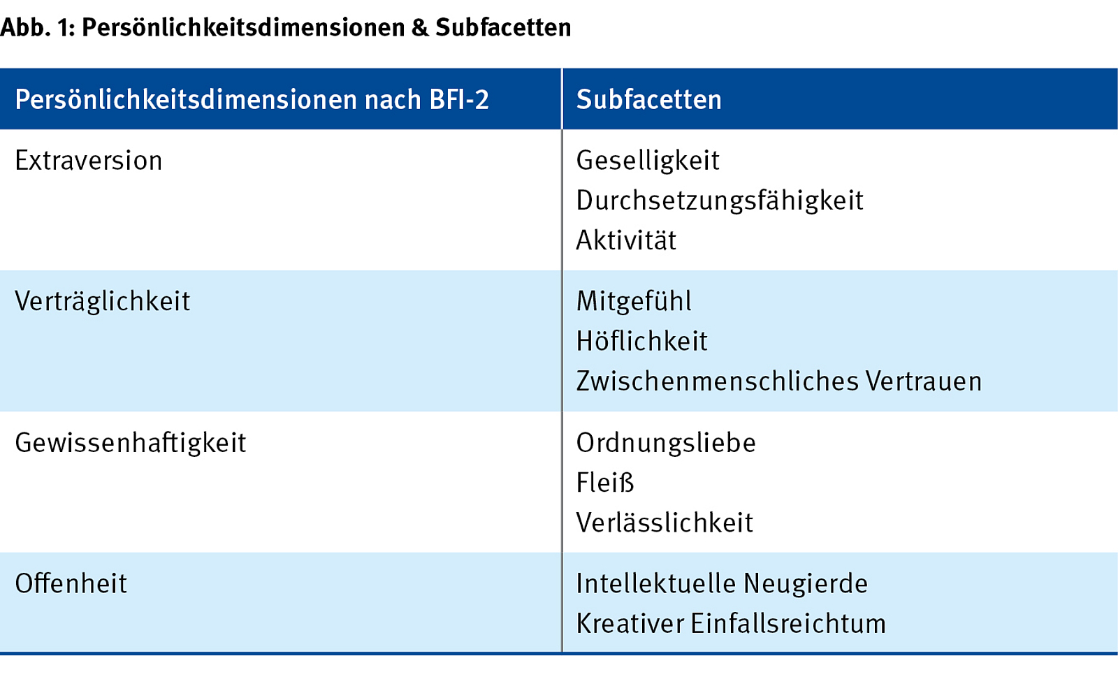 Im Rahmen der Studie wurden das Sicherungspersonal unterschiedlicher Sicherungsfirmen und deren Vorgesetzte befragt. Die Mitarbeiter der teilnehmenden Firmen (Sipo und Sakra) erhielten einen Fragebogen zur Selbsteinschätzung und wurden gebeten, ihre persönliche Einschätzung zu bestimmten Aussagen, die hauptsächlich ihre Person bzw. ihr Verhalten betreffen, abzugeben. Die Persönlichkeitseigenschaften wurden mit der deutschen Skala BFI-2 von Danner et al. (2016) [3] erfasst. Die für die Befragung herangezogenen Persönlichkeitsdimensionen und Subfacetten sind in Abb. 1 dargestellt.