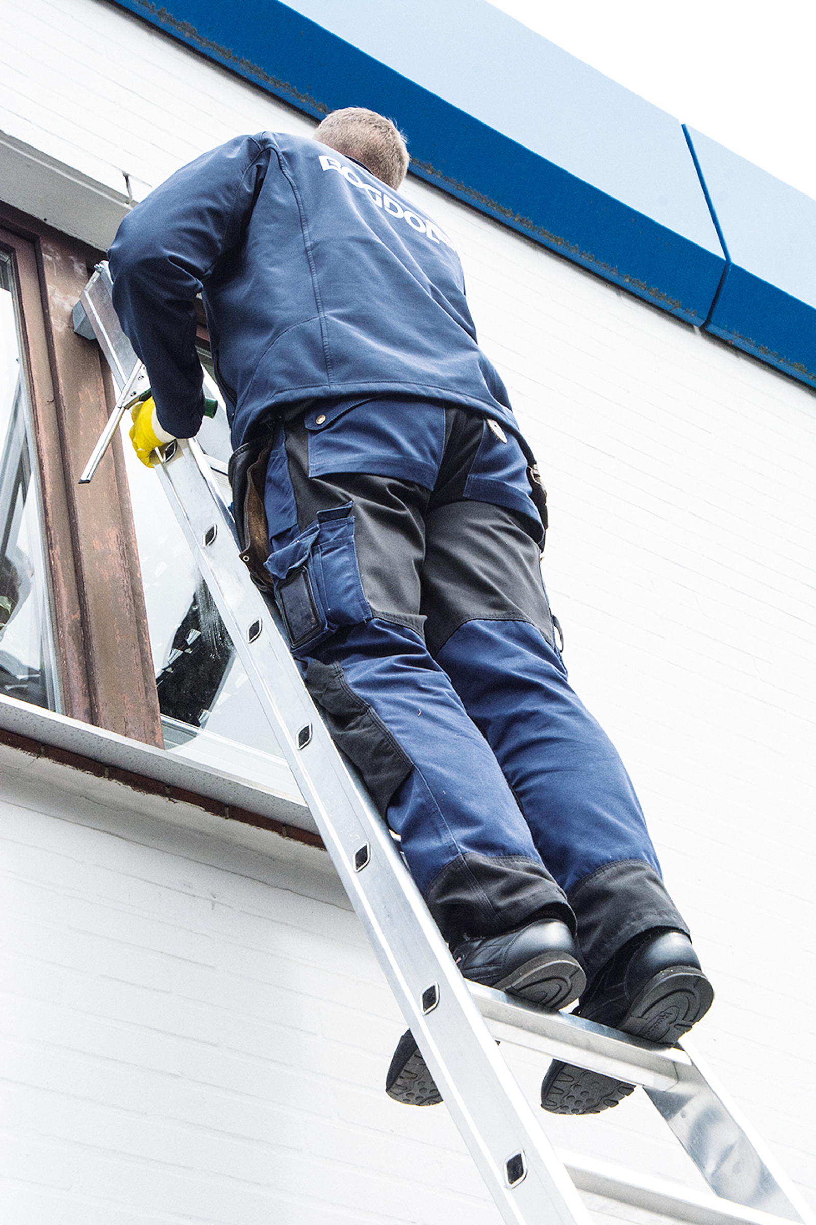 Die BOGDOL Gebäudemanagement GmbH ersetzte aufgrund der TRBS 2121-2 die bisher verwendeten Sprossenleitern durch Stufenleitern. Nach anfänglicher Skepsis während der Umstellungsphase kommt die neue Leiter mit Stufen bei den Glasreinigern sehr gut an. Frank Lindner, langjähriger Geselle bei der BOGDOL Unternehmensgruppe: „An das Tragen der Leiter musste ich mich erst gewöhnen, da die Stufen im Verhältnis zur Sprosse sehr breit sind. Jedoch ist das Arbeiten auf der Stufenleiter durch den neuen Standkomfort deutlich angenehmer, da das Fußbett optimal entlastet wird.“