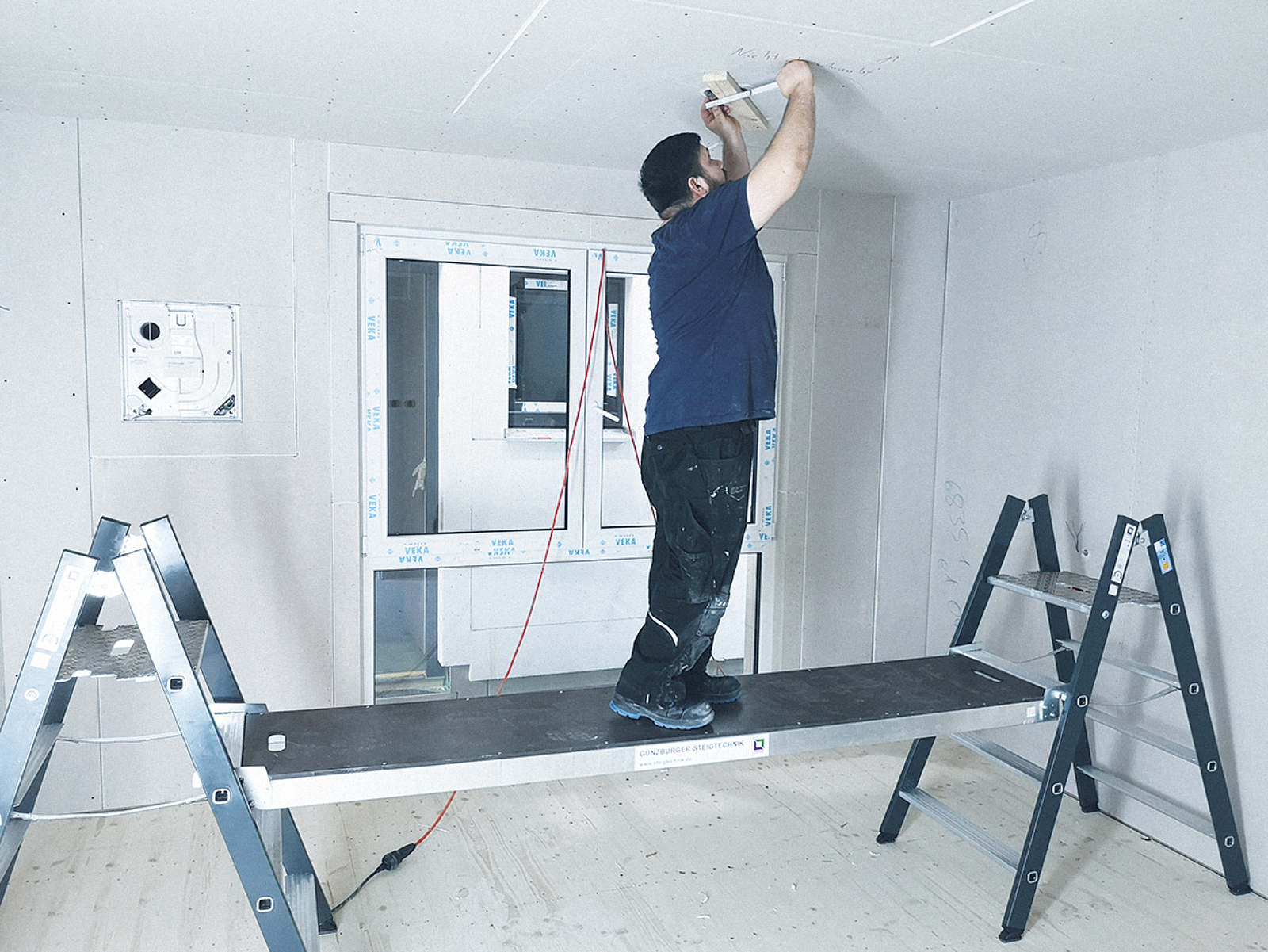 Der eingesetzte Alu-Tritt (dreistufig und vierstufig) entsprach den herausgearbeiteten Anforderungen. Die deutlich angenehmere, breitere und in verschiedenen Längen verfügbare Plattform bietet einen sicheren Stand und ermöglicht ein sicheres Bewegen – von dort aus können sich Nutzende sehr gut in alle Richtungen bewegen. Zudem bieten die breiten Stufen ein besseres Auftreten, was den Gebrauch deutlich angenehmer und sicherer gestaltet. Durch zusätzliche Anbauten – wie der Ablagebox am oberen Wangengelenk – gewinnt der Tritt an Attraktivität, denn es kann Werkzeug und Material abgelegt werden und dies auch trotz Zusammenklappen des Tritts und Weitertransport an einen anderen Aufstellort. Durch den Klappmechanismus lässt sich der Tritt mit einem Arm auf- und zuklappen. Ein umständliches Zusammenklappen des Tritts wäre ein Ausschlusskriterium gewesen, weil es einfach und schnell gehen muss und die Akzeptanz bei den Beschäftigten hohe Priorität hat. Kombiniert mit einer Arbeitsdiele, die zum System passt, bieten die Tritte vor allem im Trockenbau gute Bedingungen, um Arbeiten sicher auszuführen. Das System lässt sich ebenfalls mit nur einem Handgriff auseinanderbauen. Auch das trug zur Akzeptanz bei.
